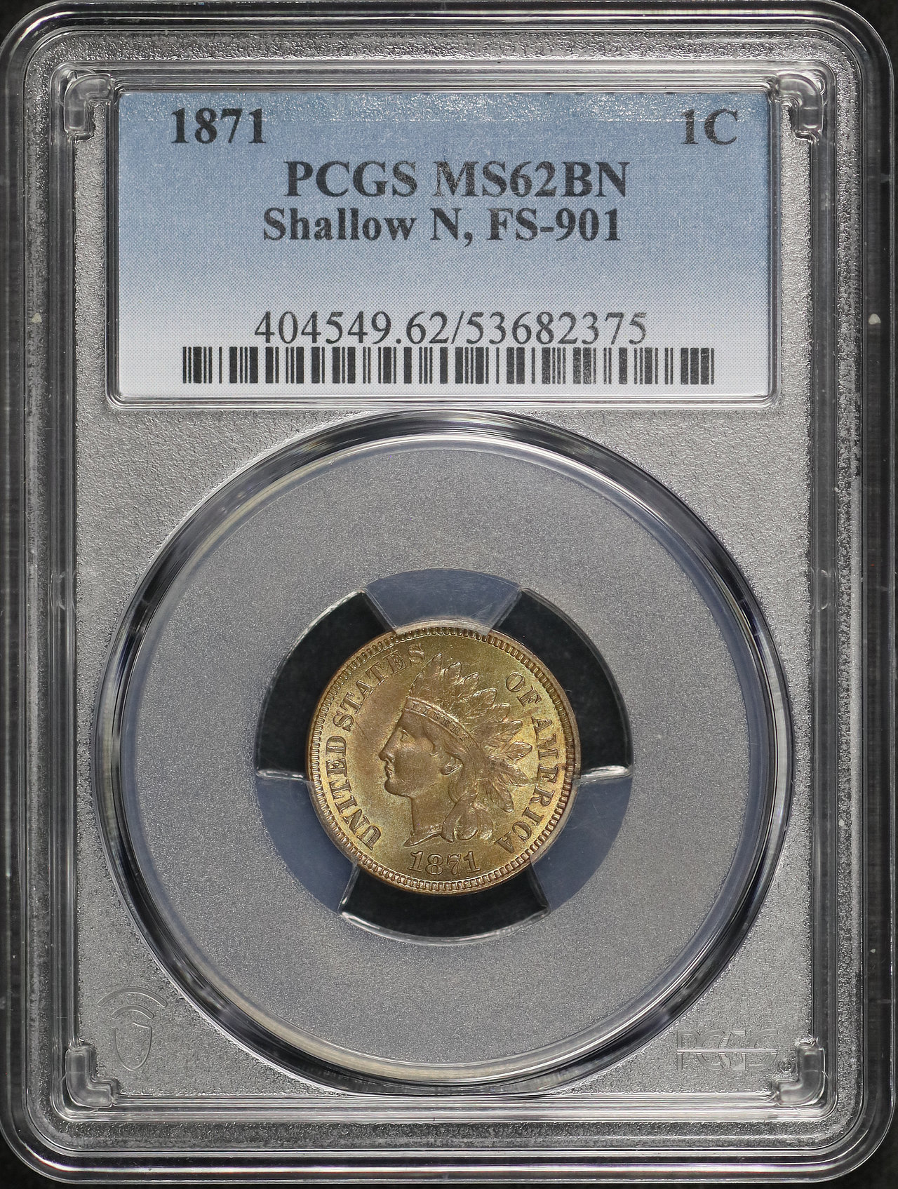 1871 Indian Cent PCGS MS-62 BN Shallow N, FS-901 designed by James Barton Longacre.