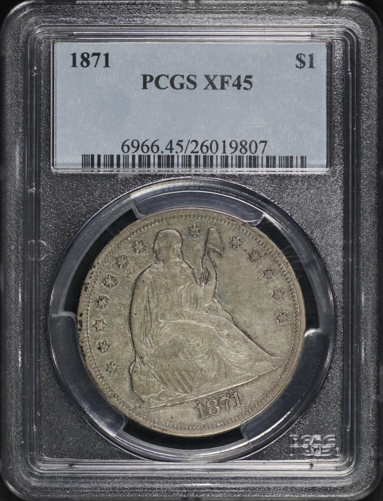 1871 Liberty Seated Dollar PCGS XF-45 designed by Christian Gobrecht.