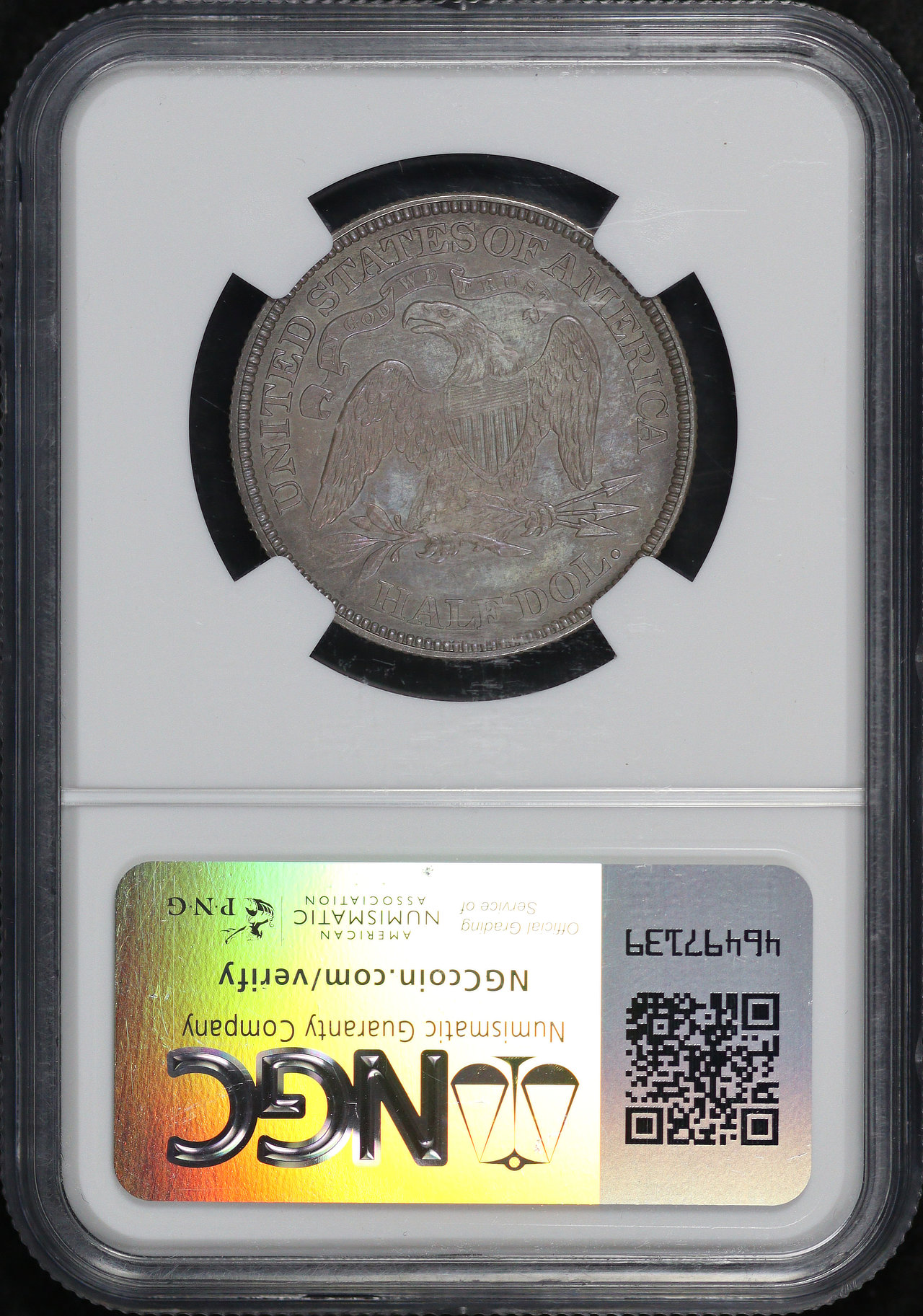 1871 Liberty Seated Half Dollar NGC PF-63. Both sides display smoky sunset hue toning. There are some minor scuffs on the NGC holder.