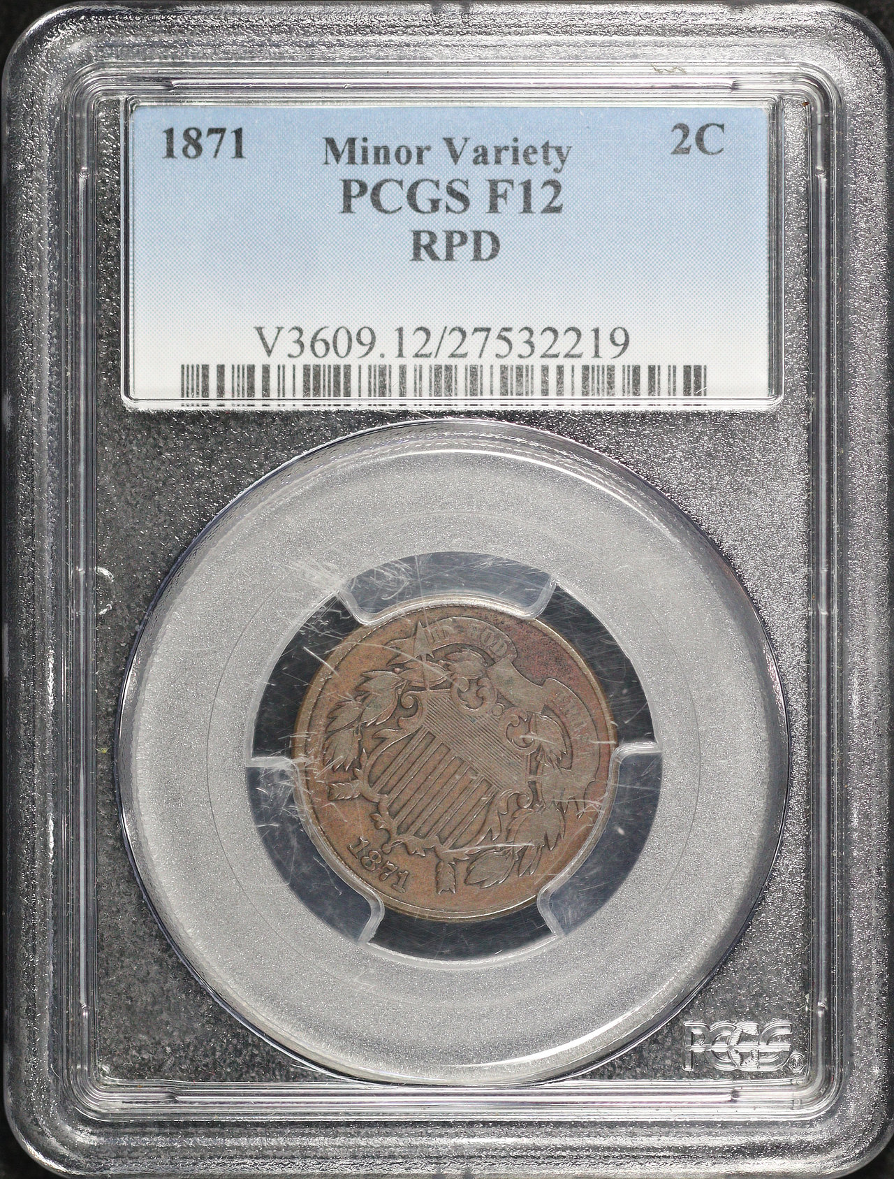 1871 Minor Variety Repunched Date Two Cent PCGS F-12