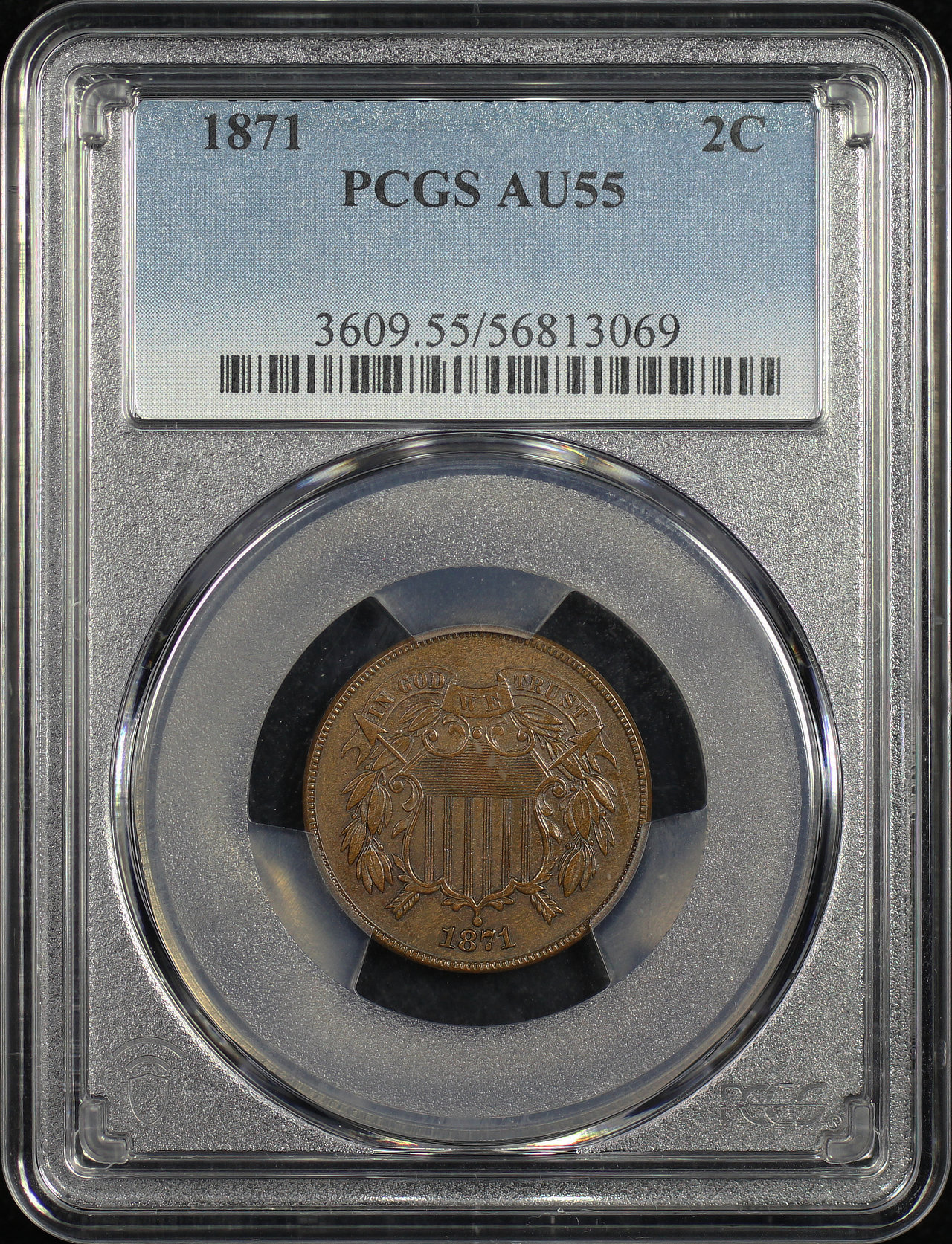 1871 Two Cent PCGS AU-55 BN designed by James Barton Longacre.
