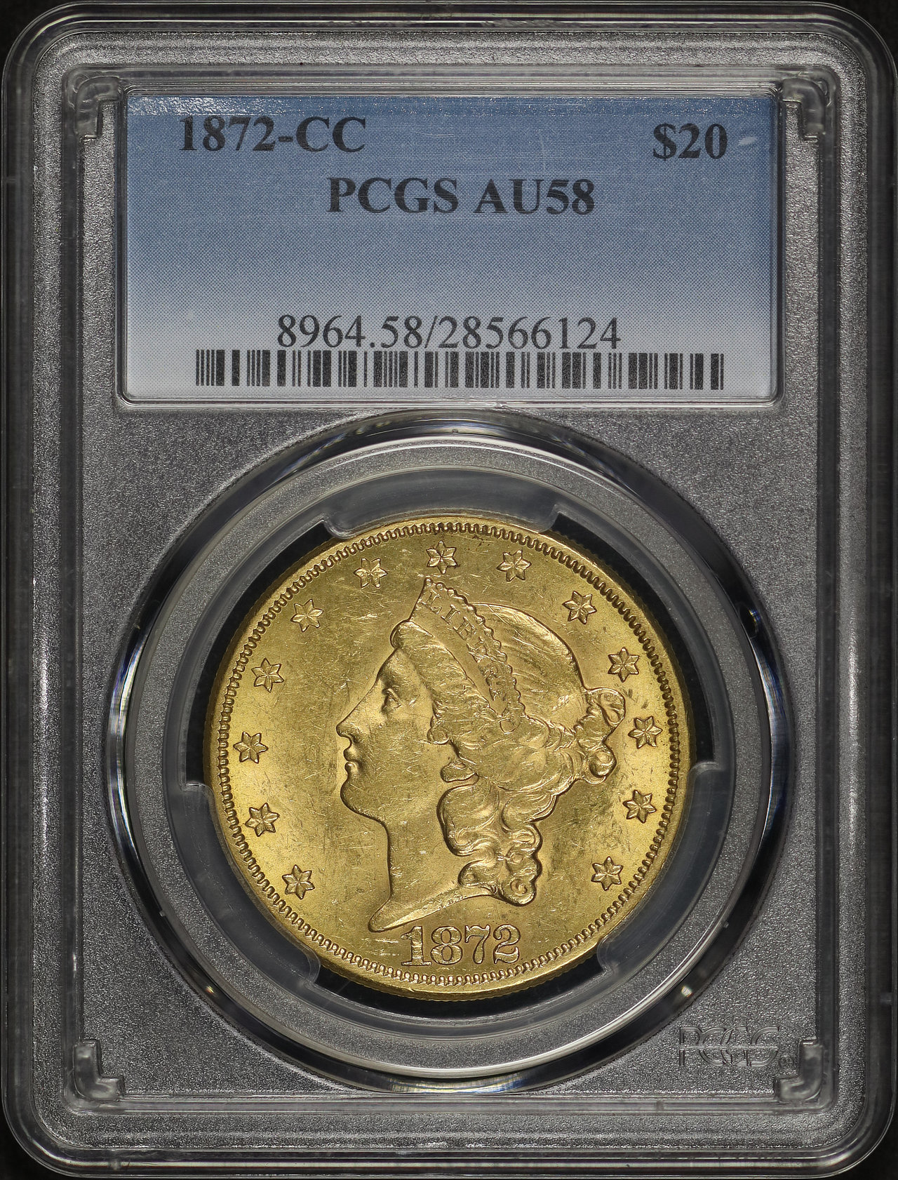 1872-CC Liberty Head $20 PCGS AU-58 designed by James Barton Longacre.