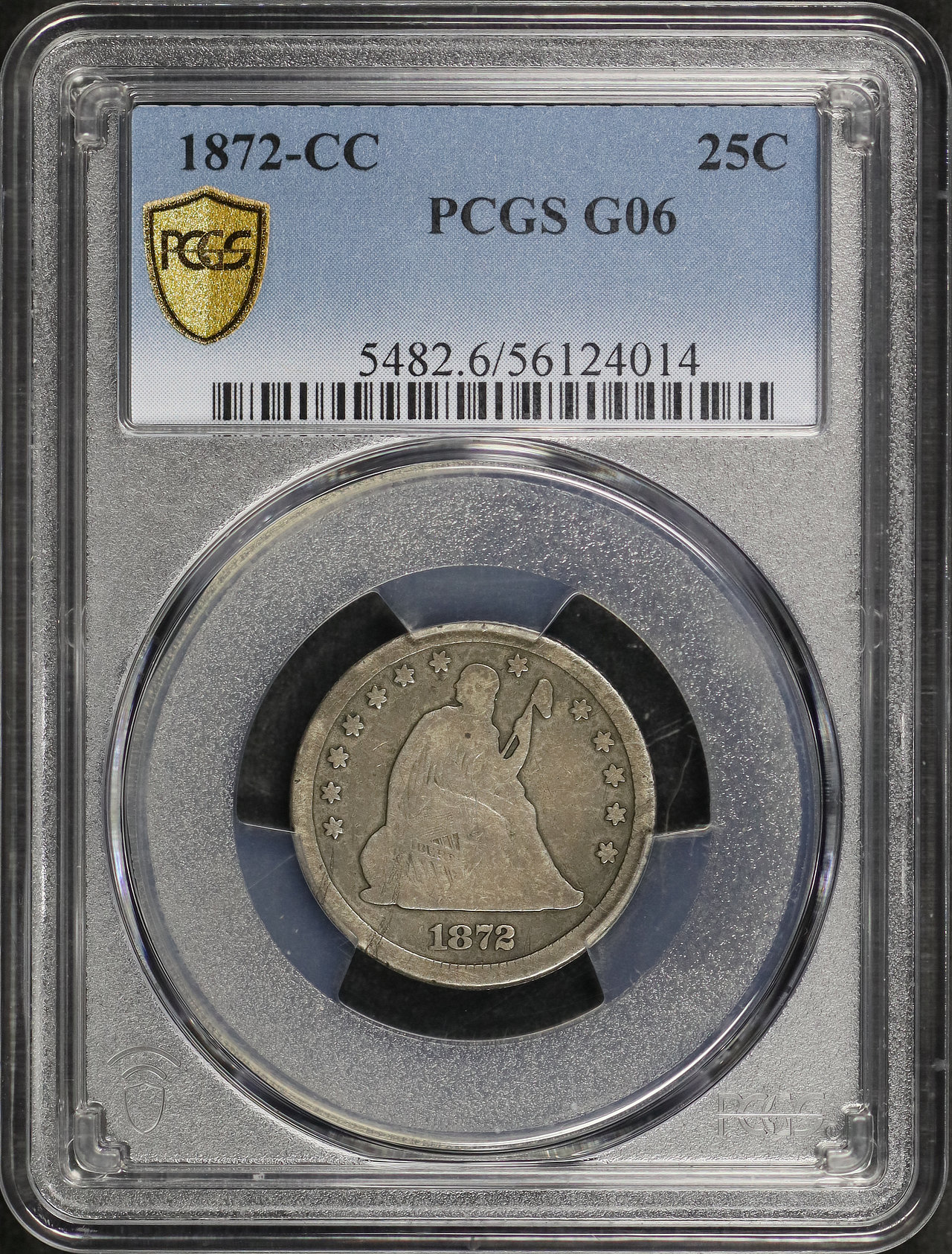1872-CC Liberty Seated Quarter PCGS G-06 designed by Robert Ball Hughes and Christian Gobrecht.