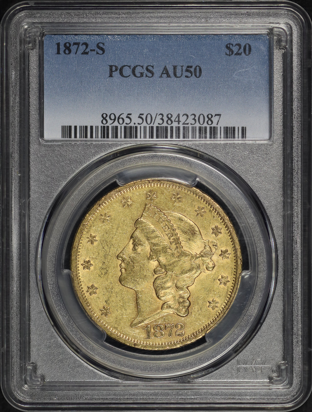 1872-S Liberty Head $20 Type 2 PCGS AU-50 designed by James Barton Longacre.