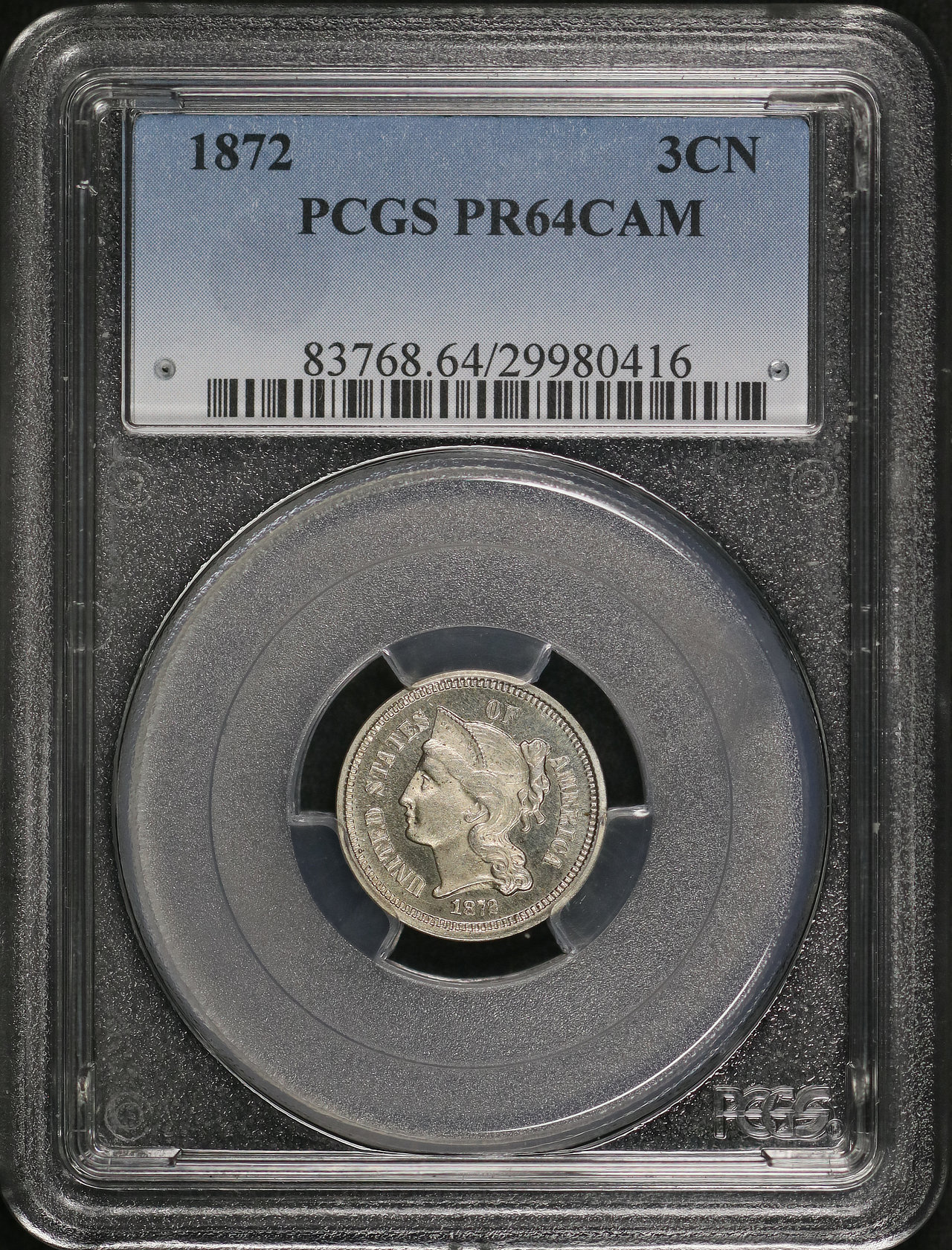 1872 Three Cent Nickel PCGS PR-64 CAM designed by James Barton Longacre.