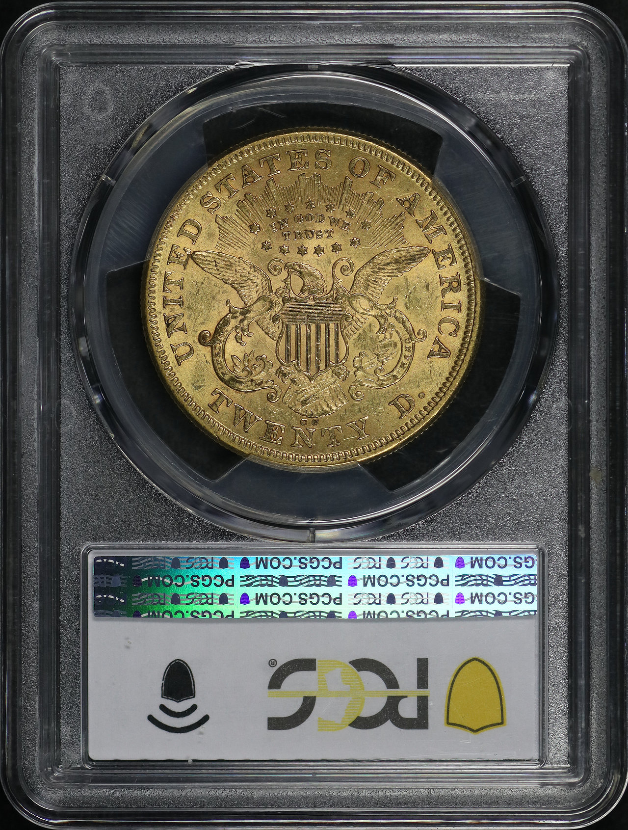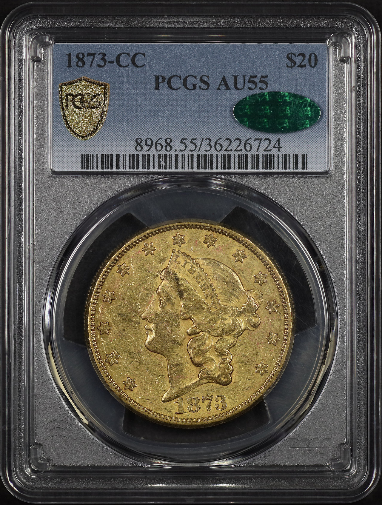 1873-CC Liberty Head $20 PCGS AU-55 CAC designed by James Barton Longacre.