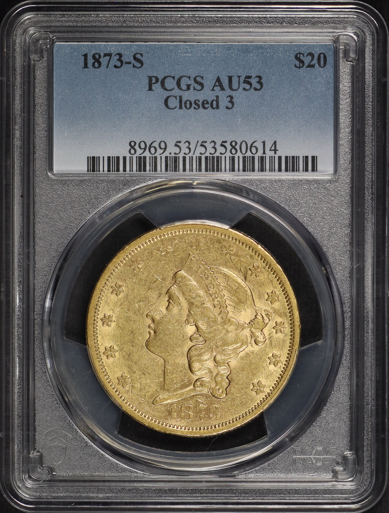 1873-S Liberty Head $20 Closed 3 PCGS AU-53 designed by James Barton Longacre.