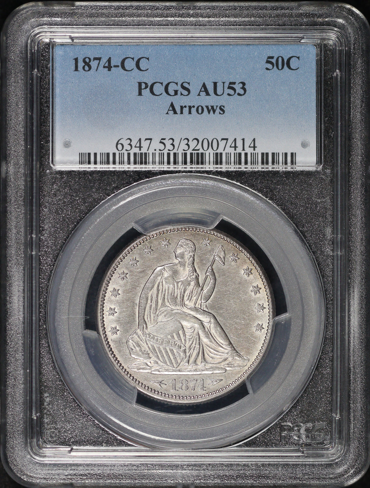 1874-CC Liberty Seated Half Dollar with Arrows PCGS AU-53 designed by Thomas Sully and Christian Gobrecht.