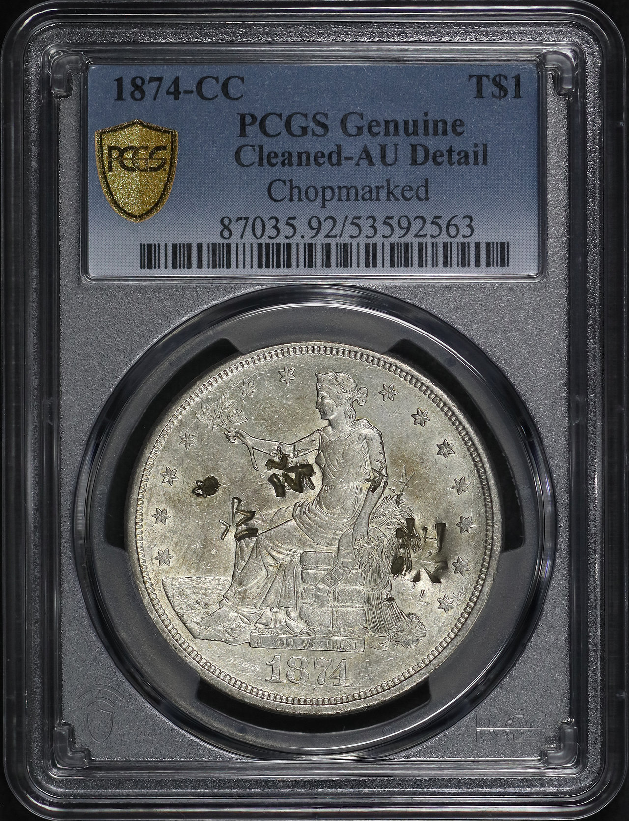 1874-CC Trade Dollar Chopmarked PCGS AU Details Cleaned designed by William Barber.