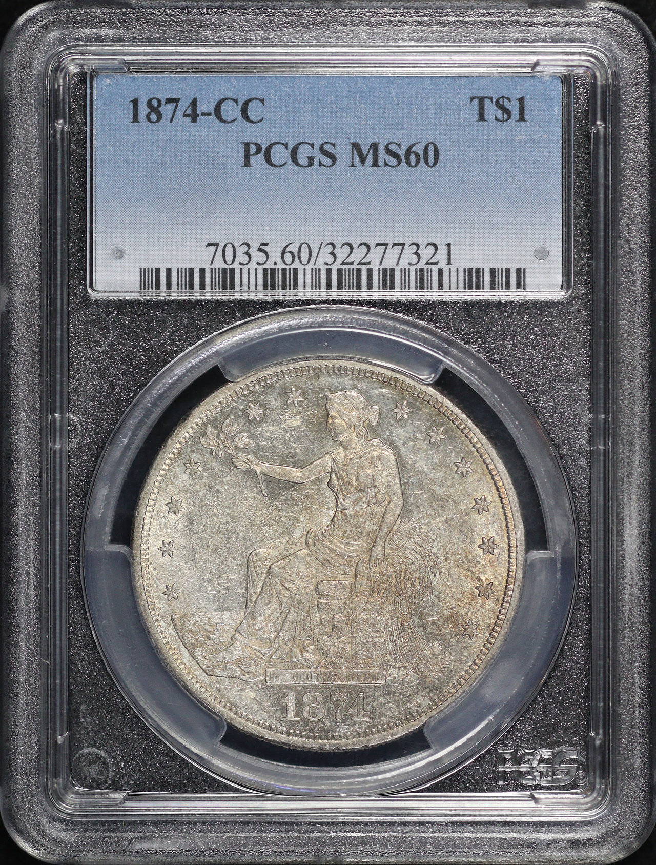 1874-CC Trade Dollar PCGS MS-60 designed by William Barber.