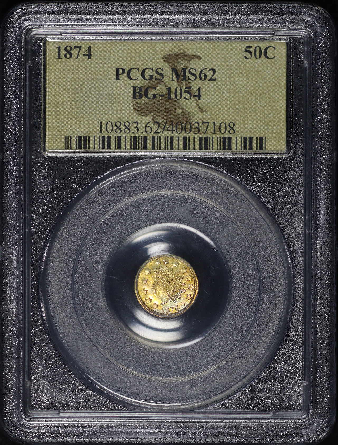 1874 G50C BG-1054 Round Indian California Fractional Gold PCGS MS-62 Prospector Label