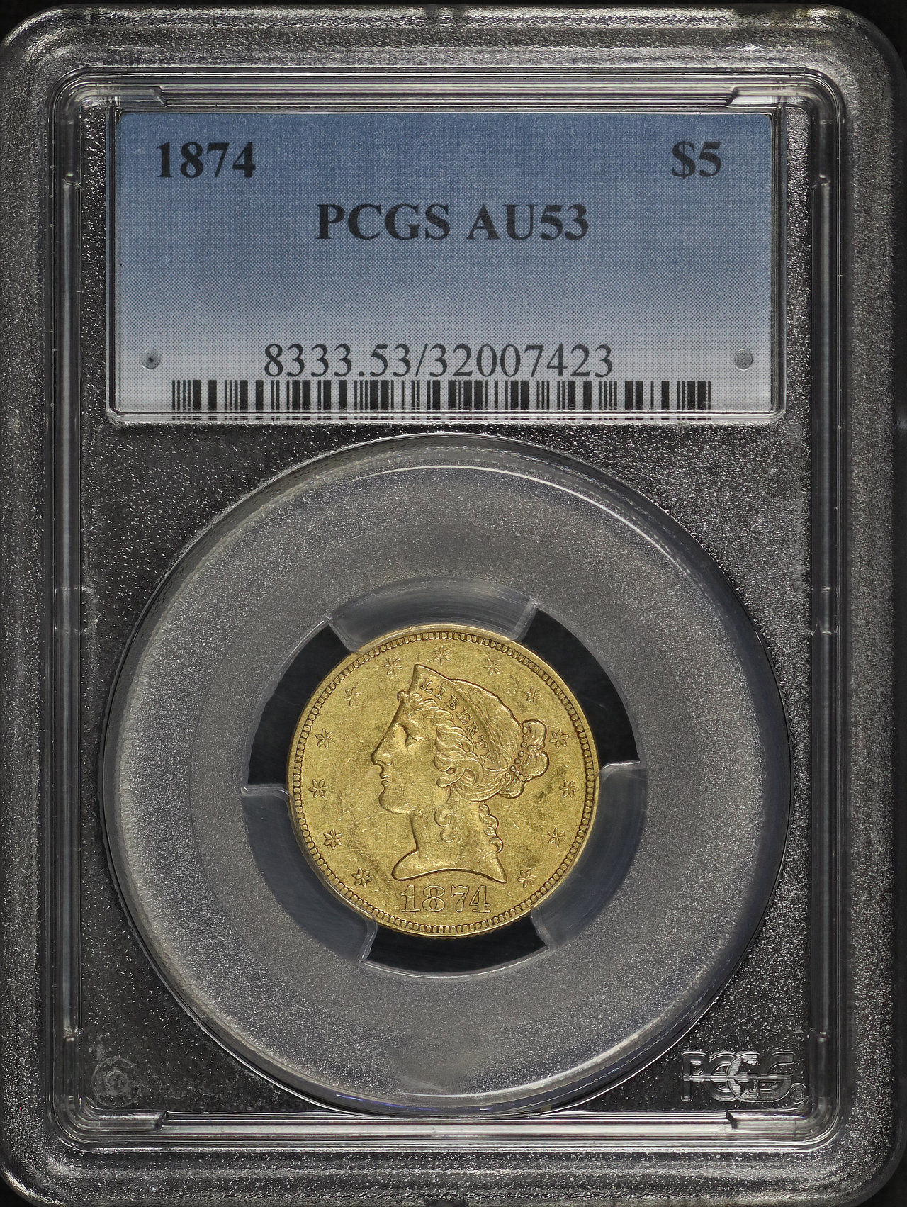 1874 Liberty Head $5 PCGS AU-53 designed by Christian Gobrecht.