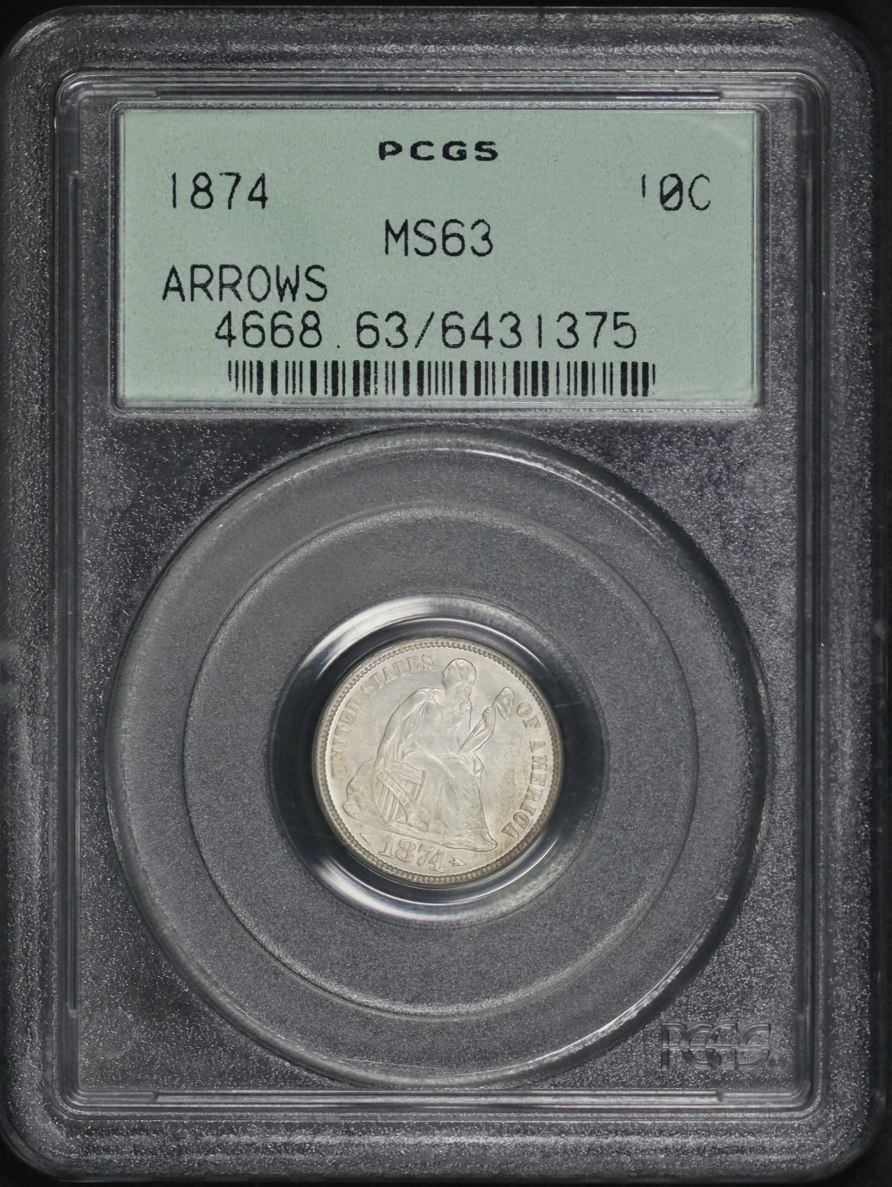 1874 Liberty Seated Dime Arrows PCGS MS-63 Old Green Holder