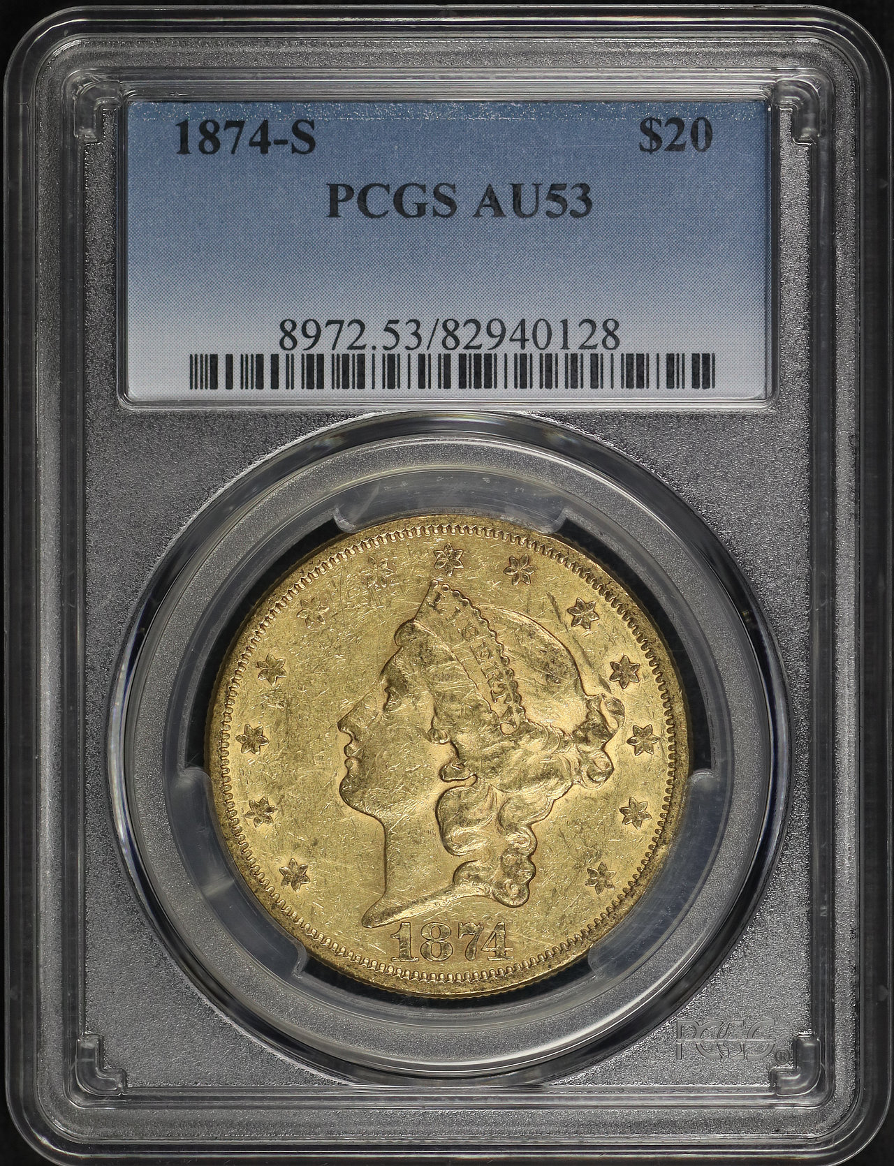 1874-S Liberty Head $20 PCGS AU-53 Type 2 designed by James Barton Longacre.