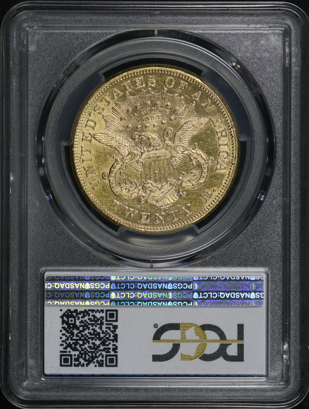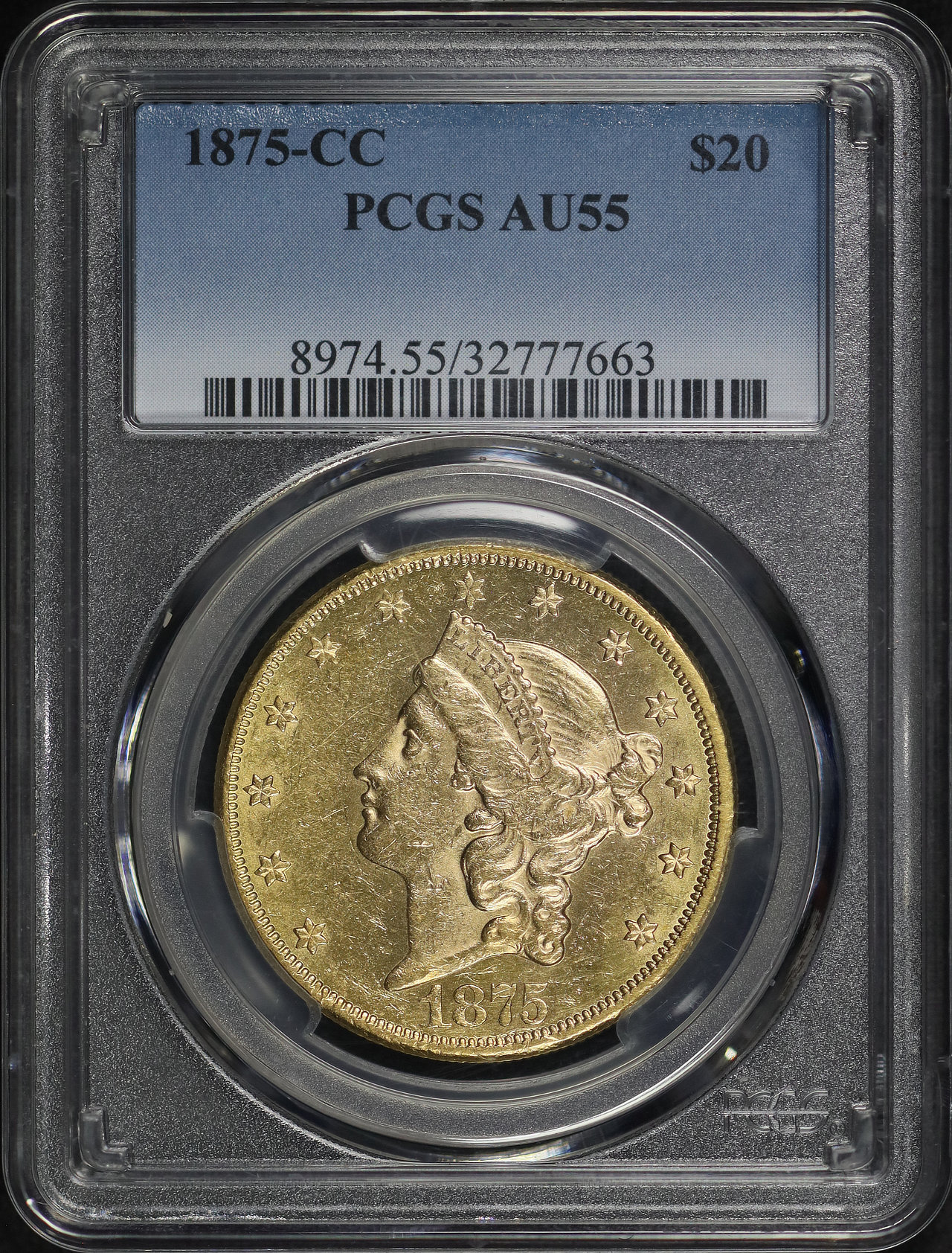 1875-CC Liberty Head $20 PCGS AU-55 designed by James Barton Longacre.
