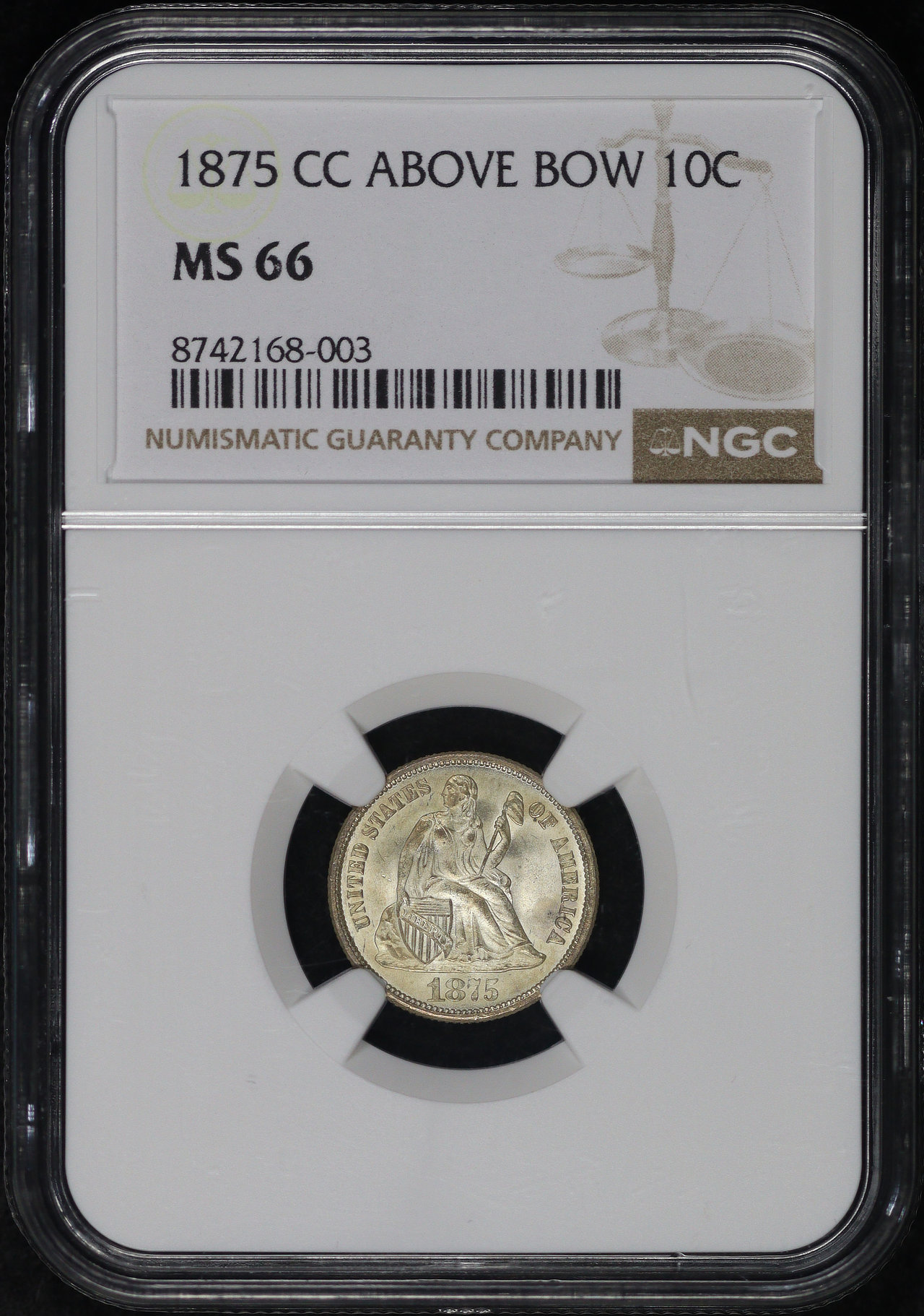 1875-CC Mintmark Above Bow Liberty Seated Dime NGC MS-66