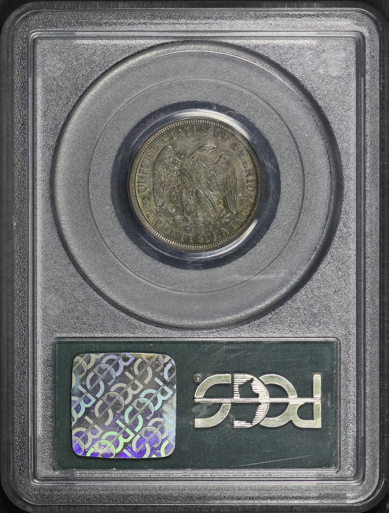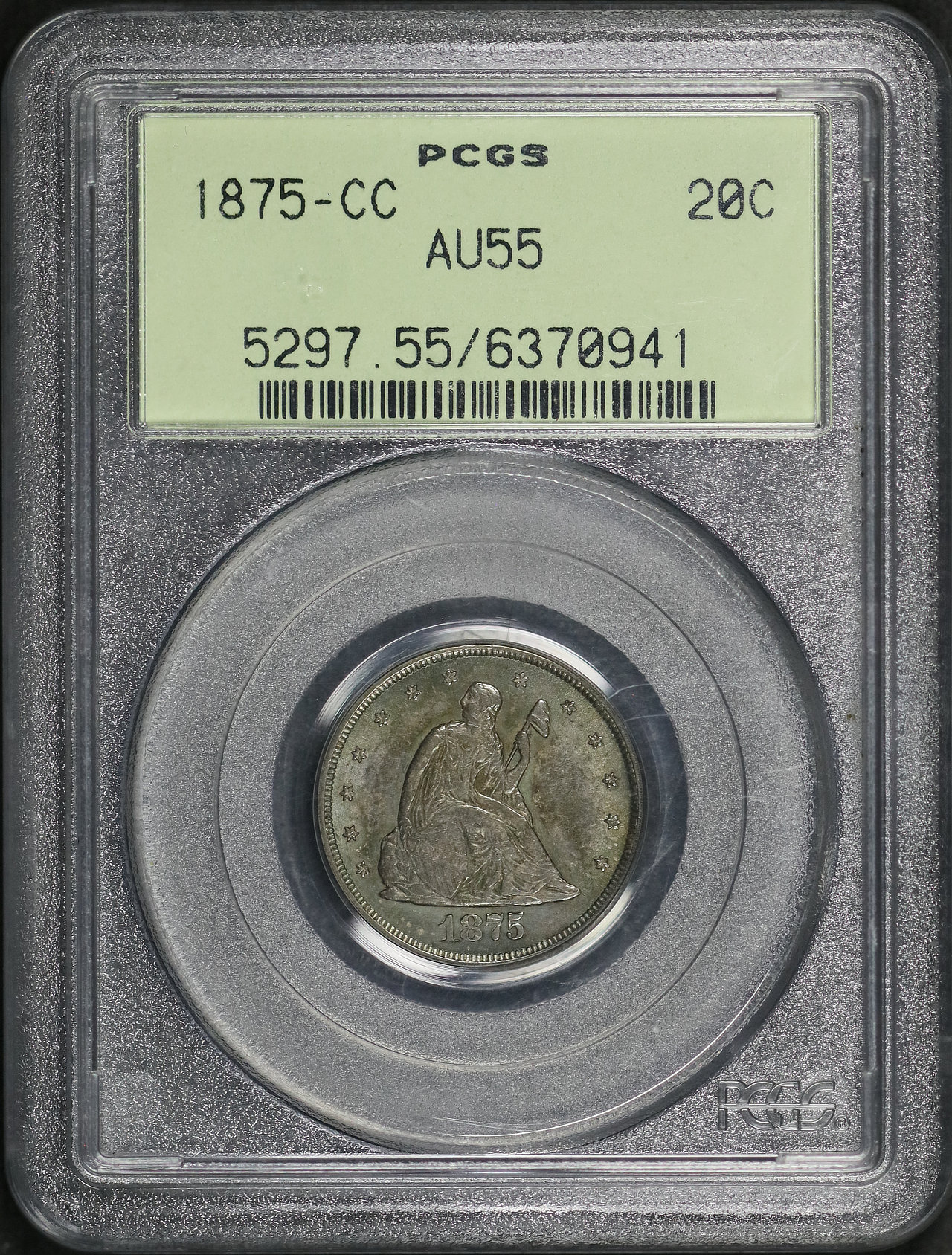 1875-CC Twenty Cent PCGS AU-55 Old Green Holder designed by William Barber.