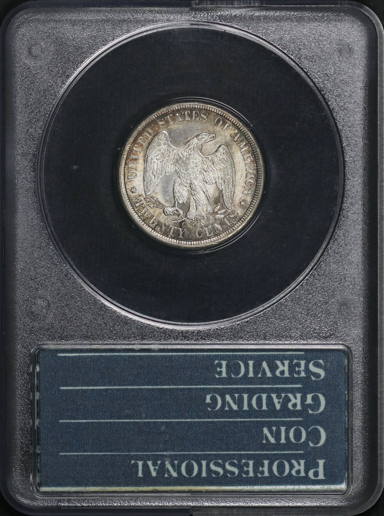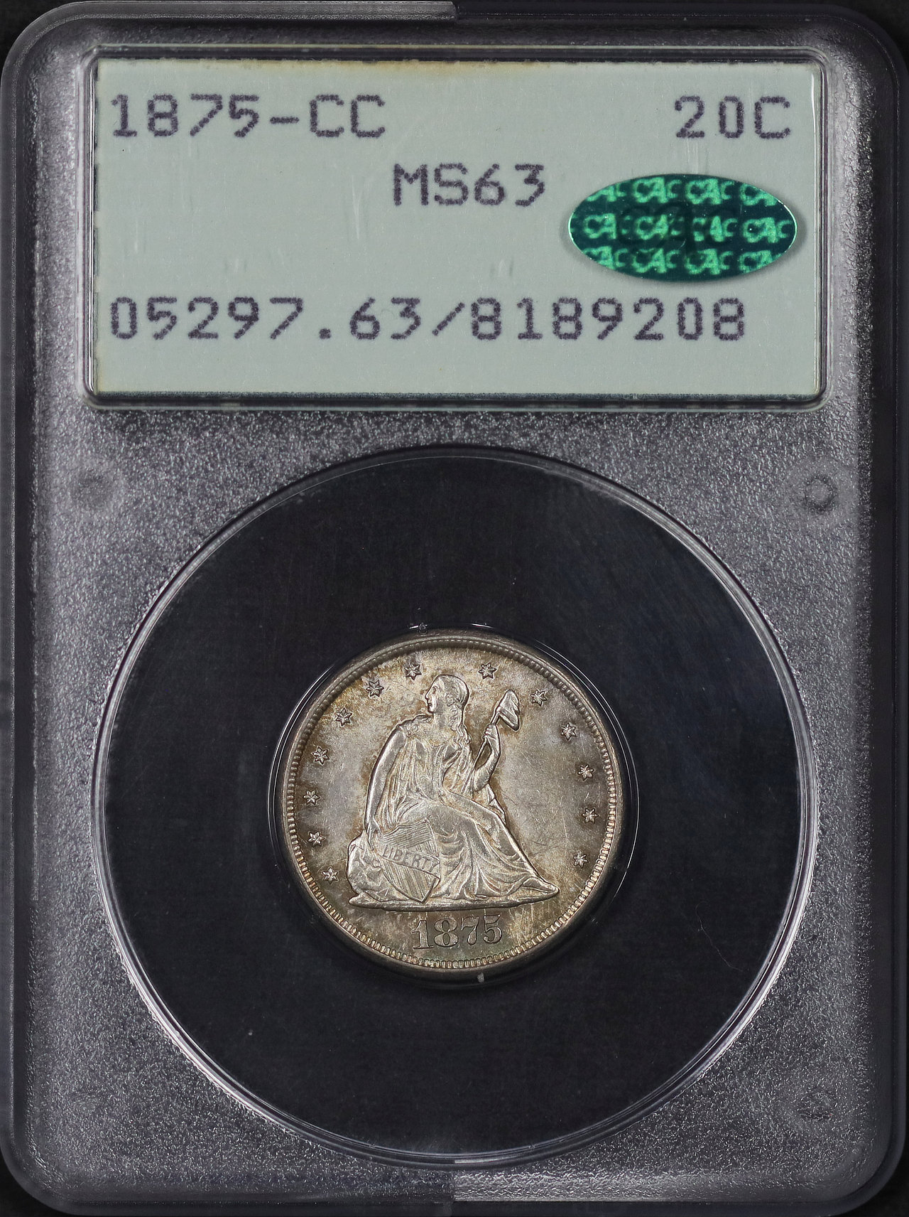 1875-CC Twenty Cent PCGS MS-63 CAC Old Green Rattler designed by William Barber.