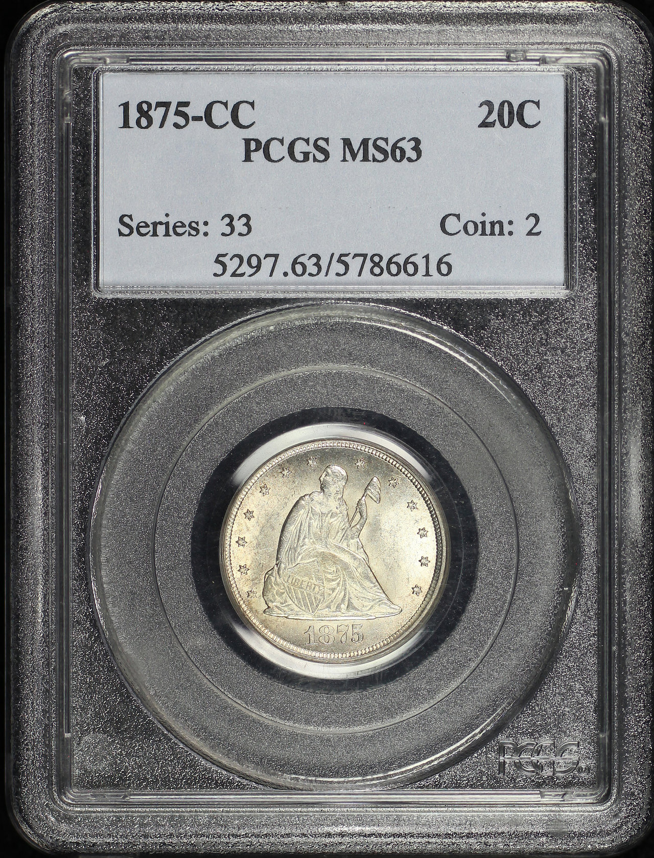 1875-CC Twenty Cent PCGS MS-63 designed by William Barber.