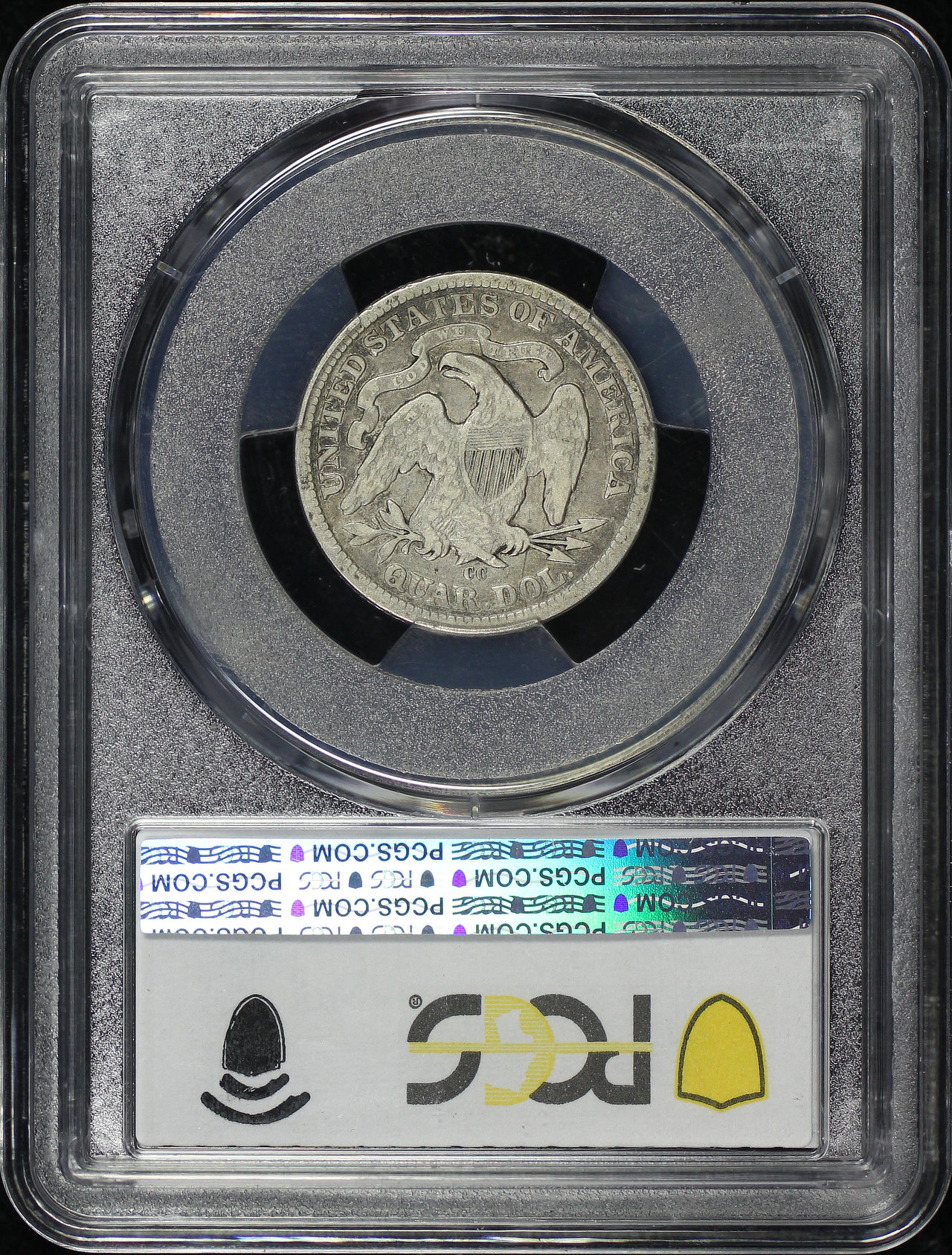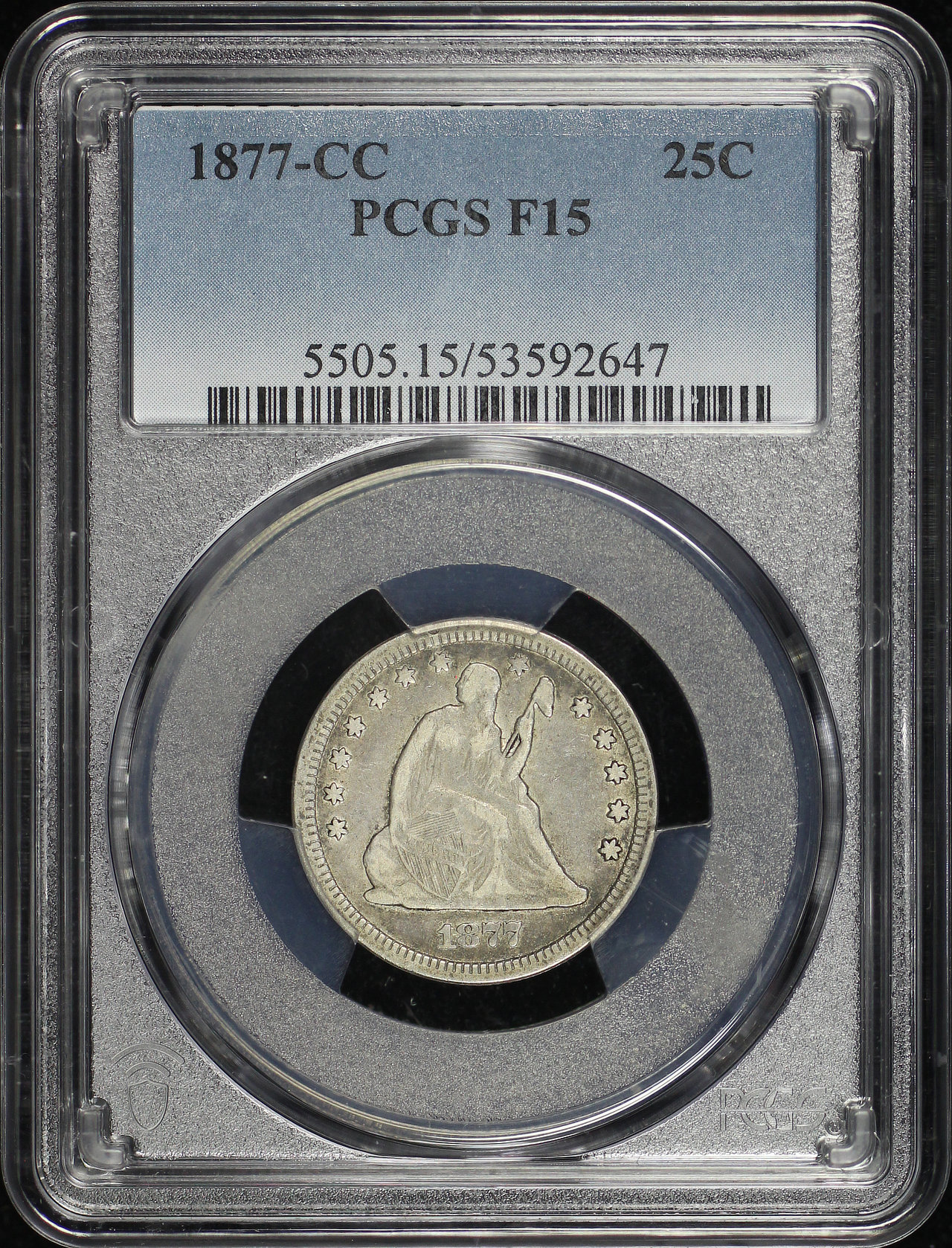 1877-CC Liberty Seated Quarter PCGS F-15 designed by Robert Ball Hughes and Christian Gobrecht.