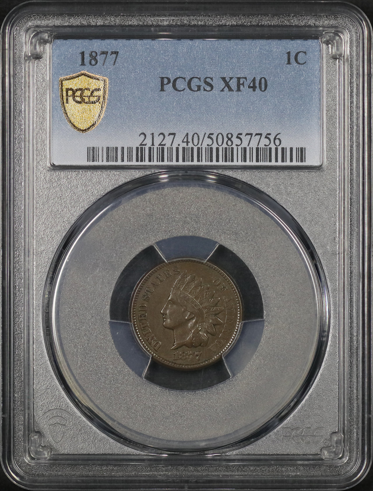 1877 Indian Cent PCGS XF-40 BN designed by James Barton Longacre.