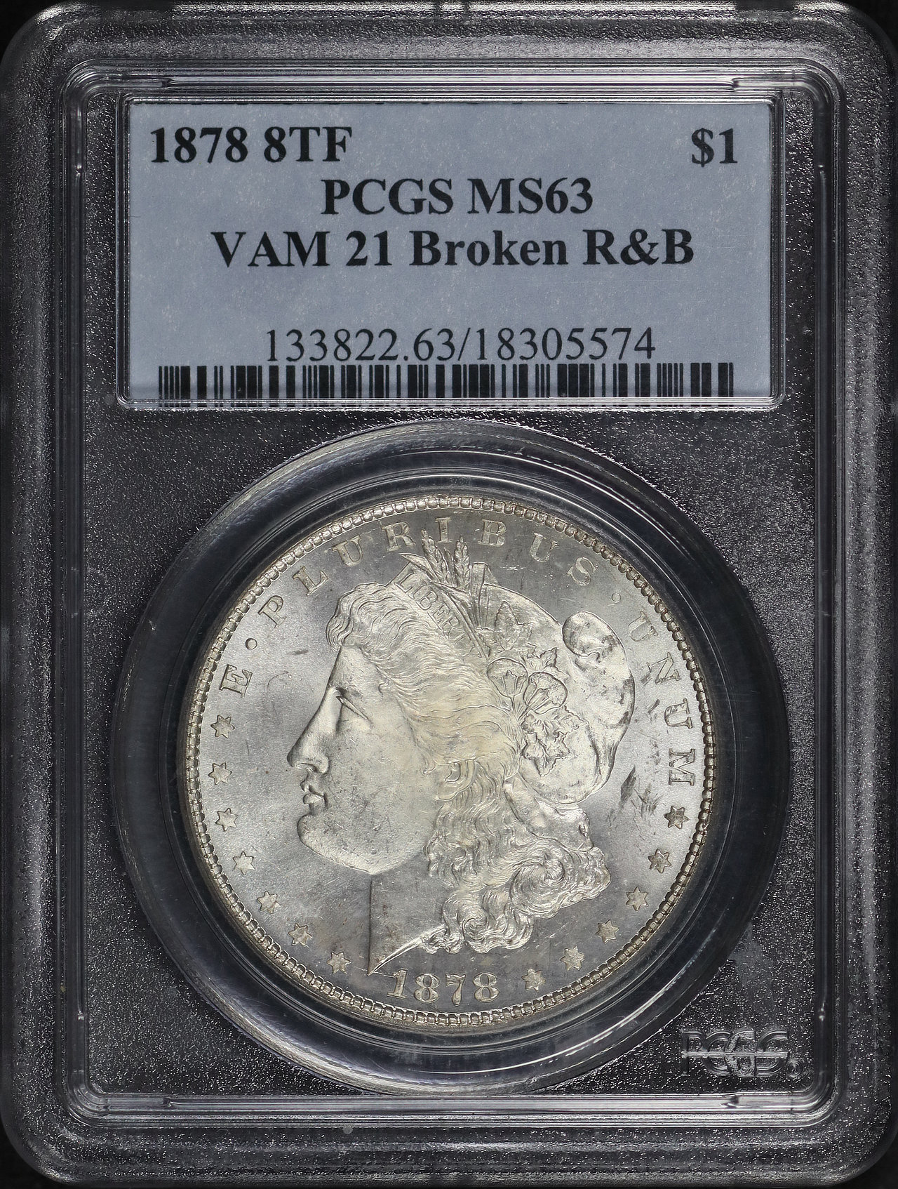 1878 8TF Morgan Dollar PCGS MS-63 VAM-21 Broken R&B designed by George T. Morgan.