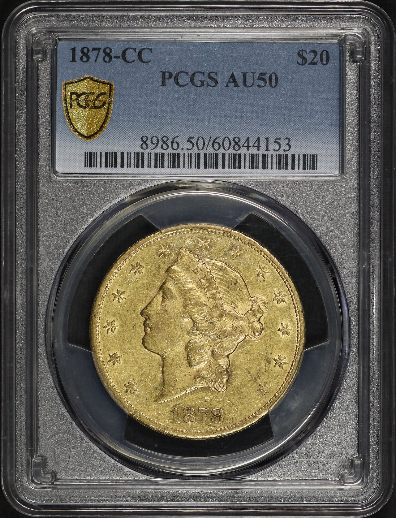 1878-CC Liberty Head $20 Type 3 PCGS AU-50 designed by James Barton Longacre.