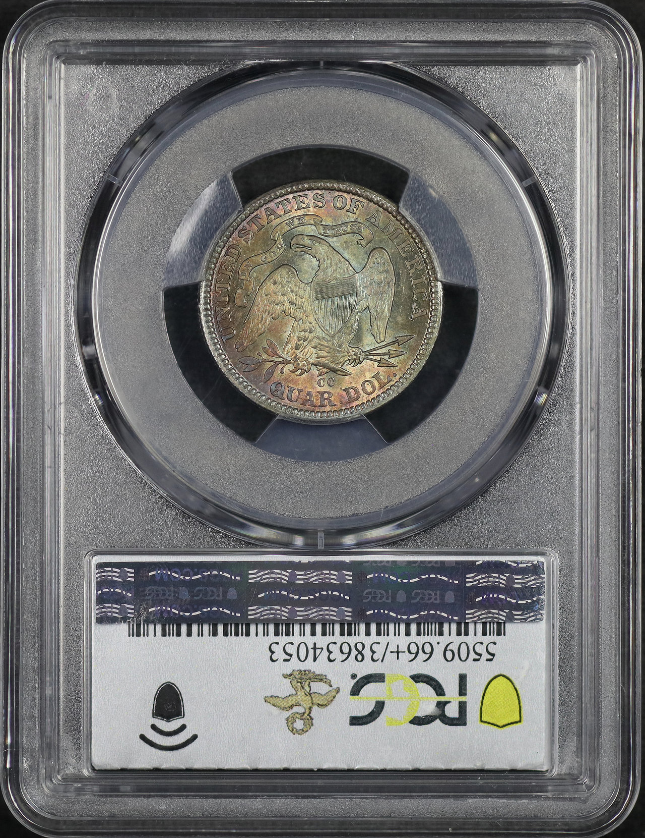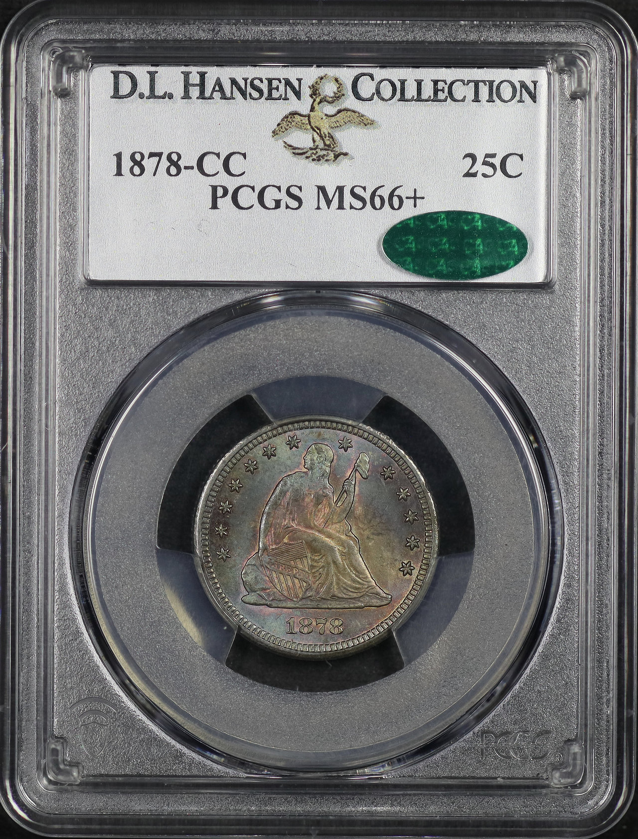 1878-CC Liberty Seated Quarter PCGS MS-66+ CAC Rainbow Toning & D.L. Hansen Collection Label designed by Robert Ball Hughes and Christian Gobrecht.