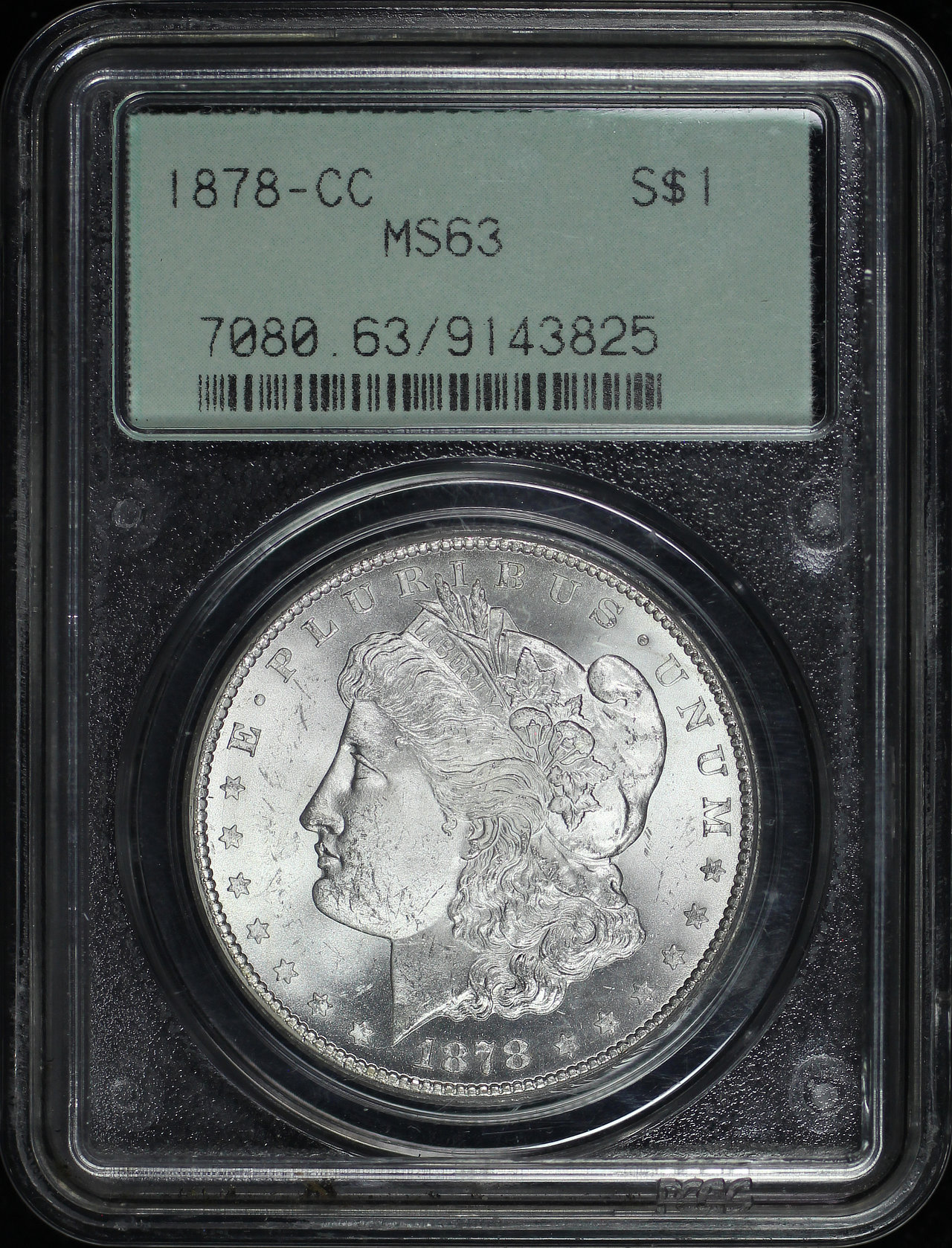 1878-CC Morgan Dollar PCGS MS-63 Old Green Gasket Holder designed by George T. Morgan.