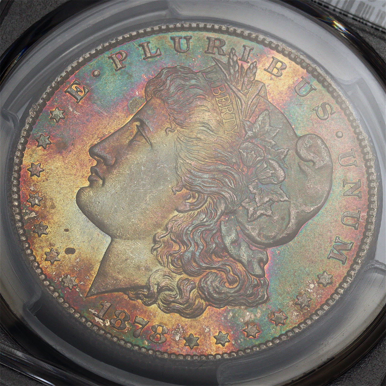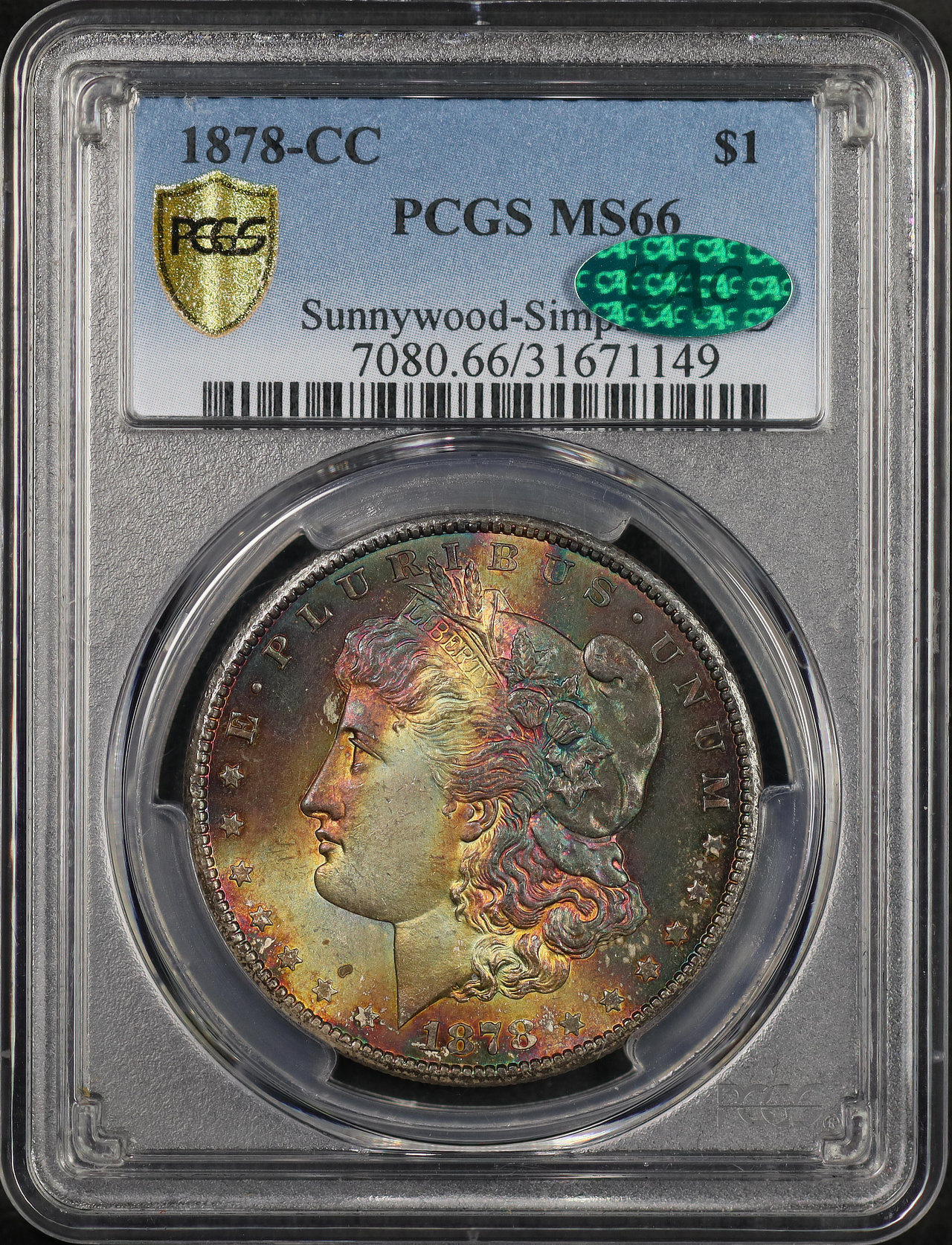 1878-CC Morgan Dollar PCGS MS-66 CAC Sunnywood-Simpson-RSD Hoard Rainbow Obverse EOR/Tab Toning