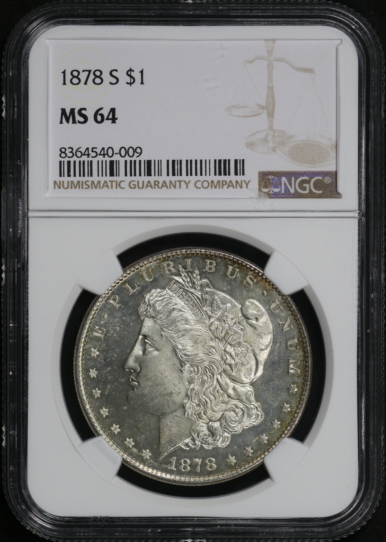 1878-S Morgan Dollar NGC MS-64. Both sides display faint orange toning along the rim. Although not attribute on the label, the coin shows a deep mirror proof-like obverse!