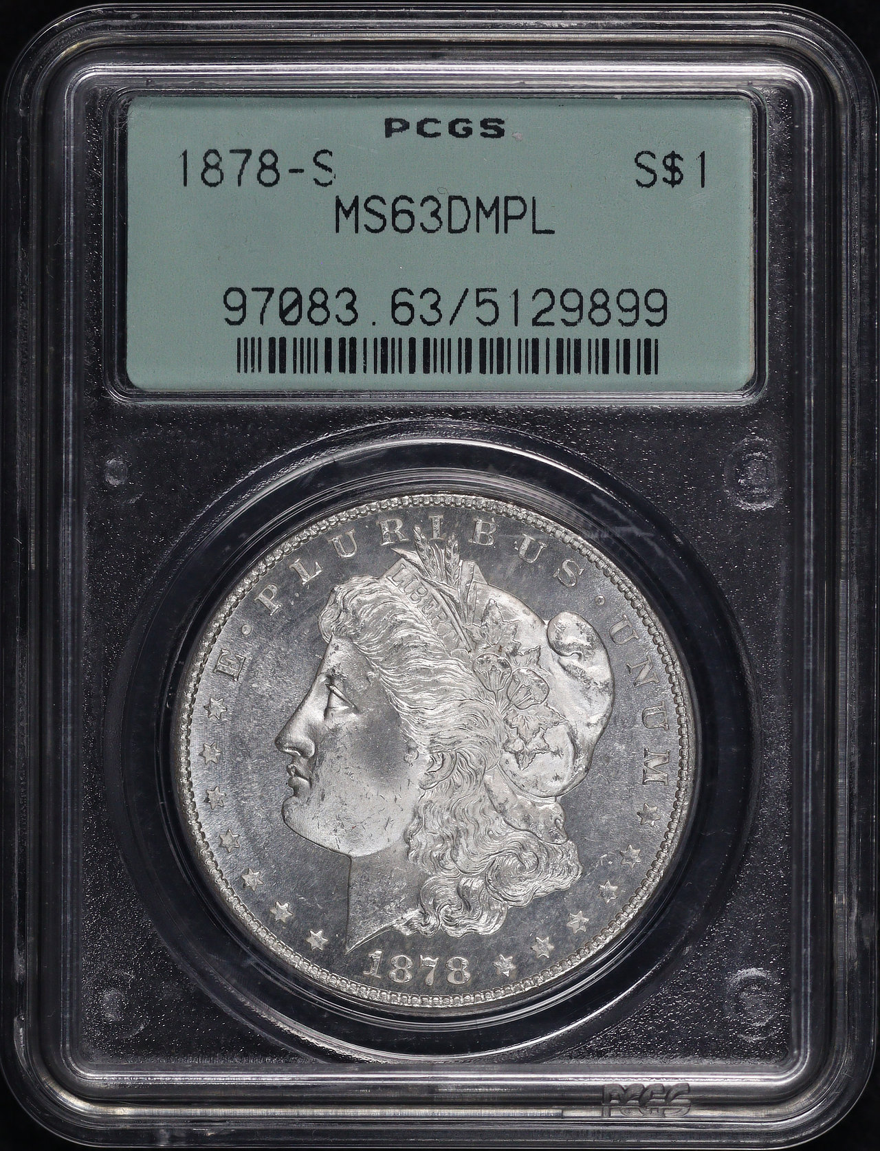 1878-S Morgan Dollar PCGS MS-63 DMPL Old Green Gasket Holder designed by George T. Morgan. There are some very minor scuffs on the PCGS holder.