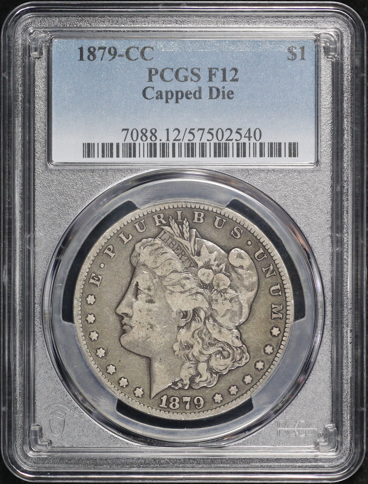 1879-CC Capped Die Morgan Dollar PCGS F-12 designed by George T. Morgan.