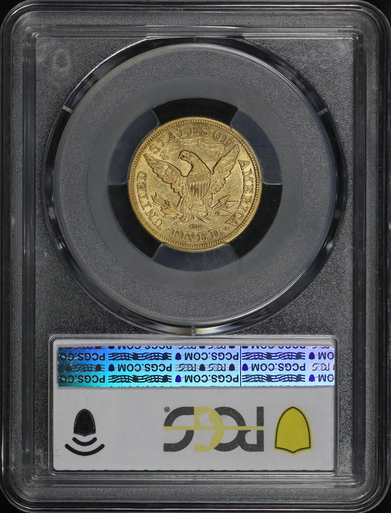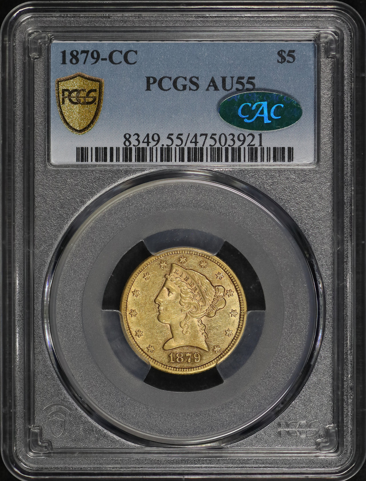 1879-CC Liberty Head $5 PCGS AU-55 CAC designed by Christian Gobrecht.