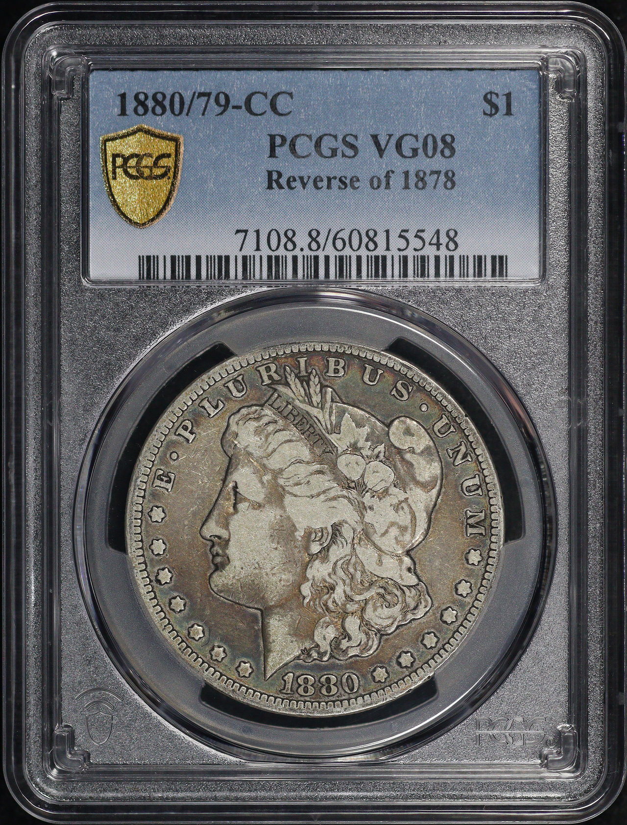 1880/79-CC Reverse of 1878 Morgan Dollar PCGS VG-08 – Dark Rainbow Obverse Toning!