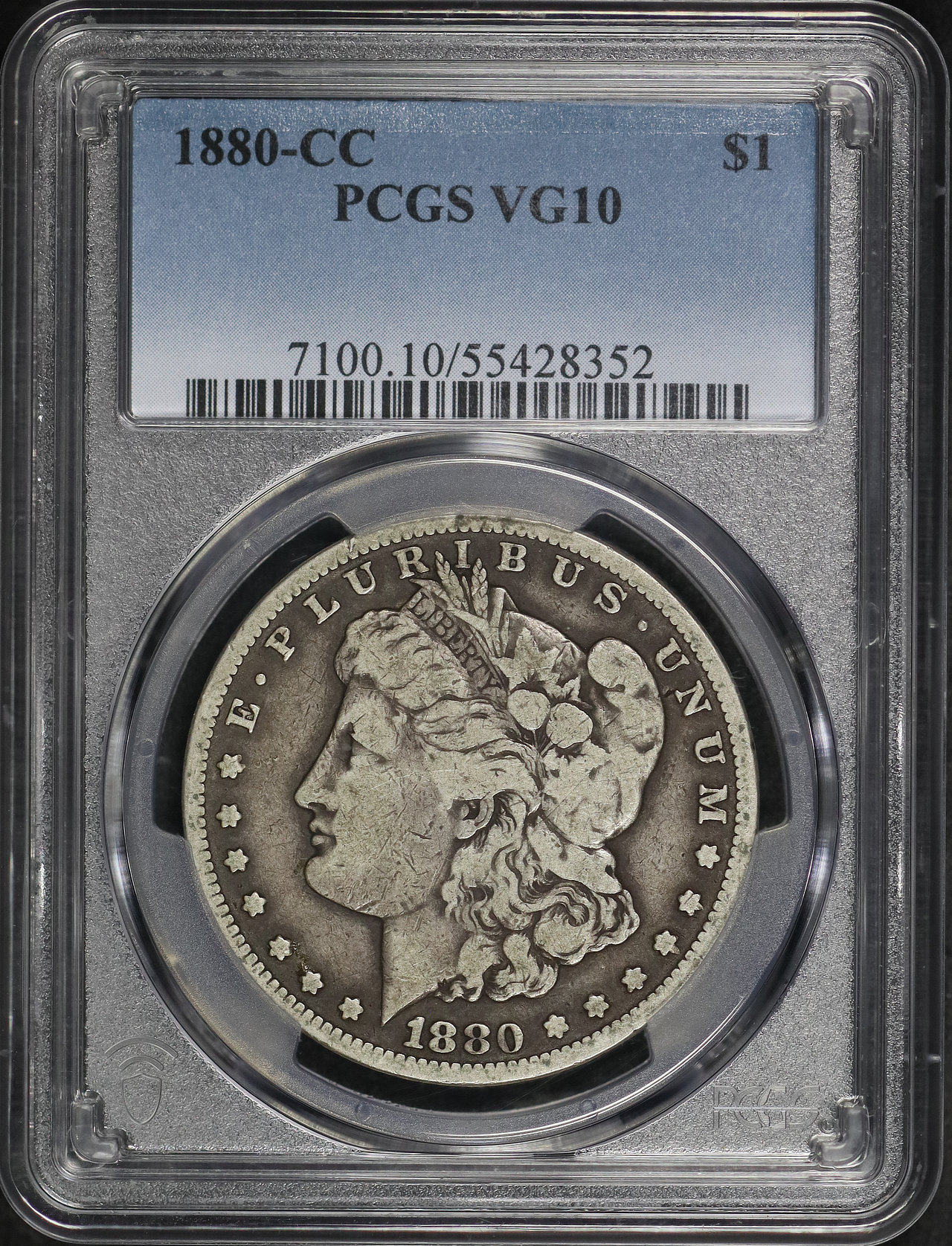 1880-CC Morgan Dollar PCGS VG-10 designed by George T. Morgan.