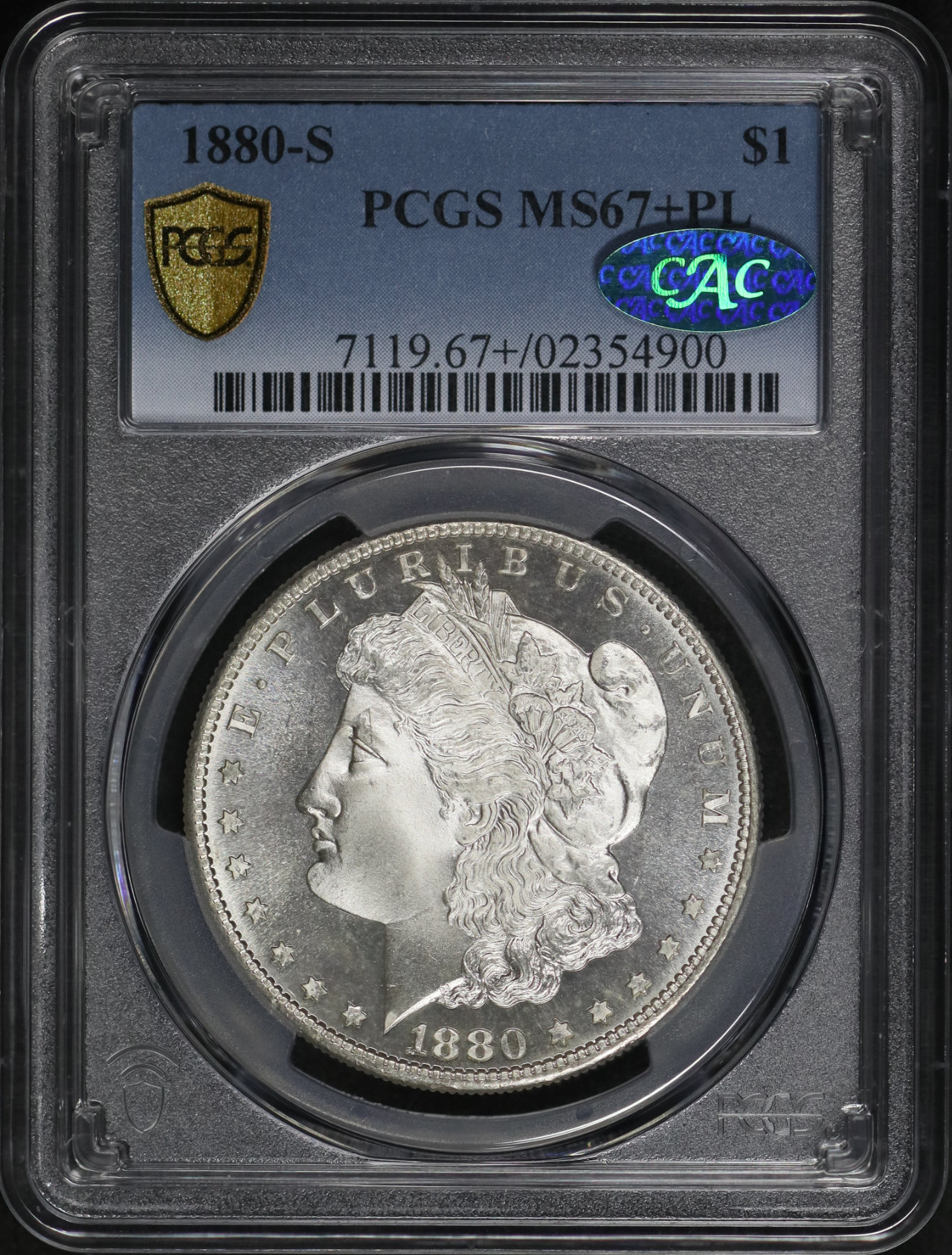 1880-S Morgan Dollar PCGS MS-67+ PL CAC designed by George T. Morgan.
