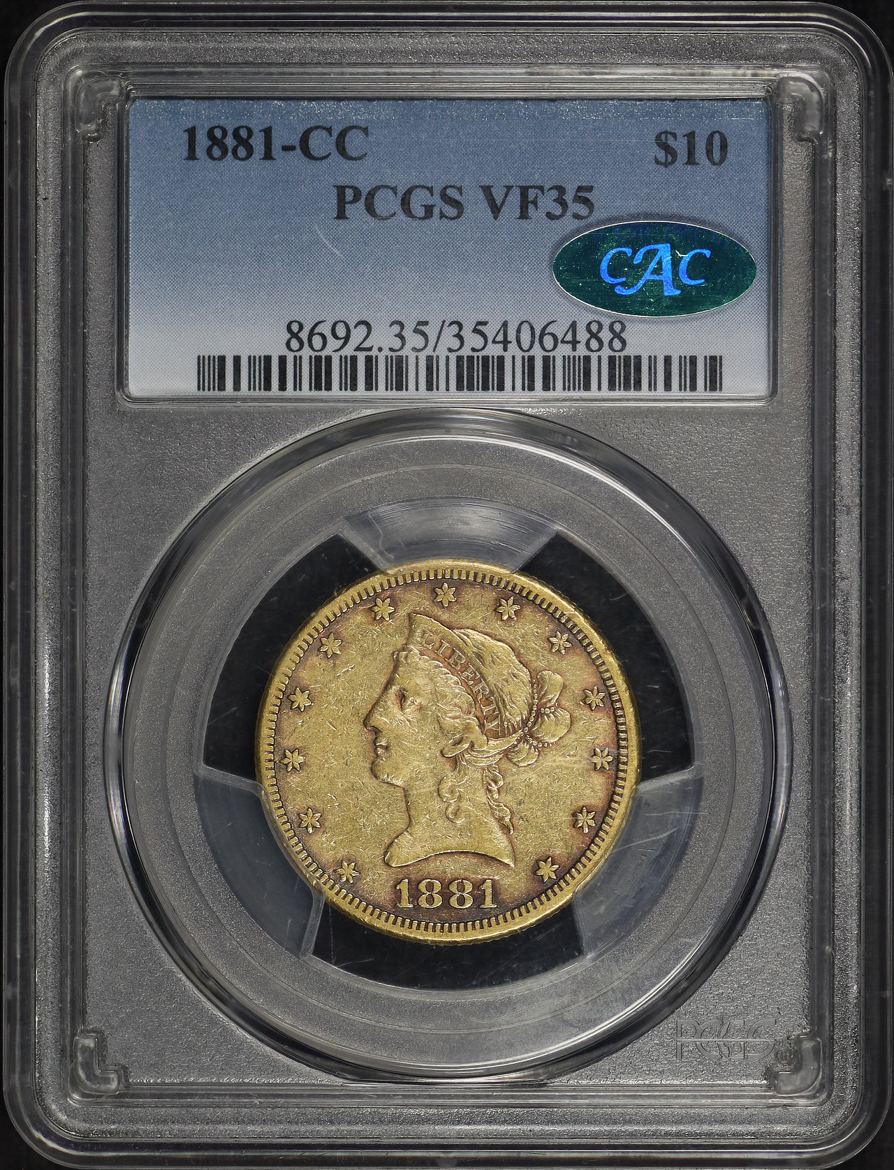 1881-CC Liberty Head $10 PCGS VF-35 CAC designed by Christian Gobrecht.