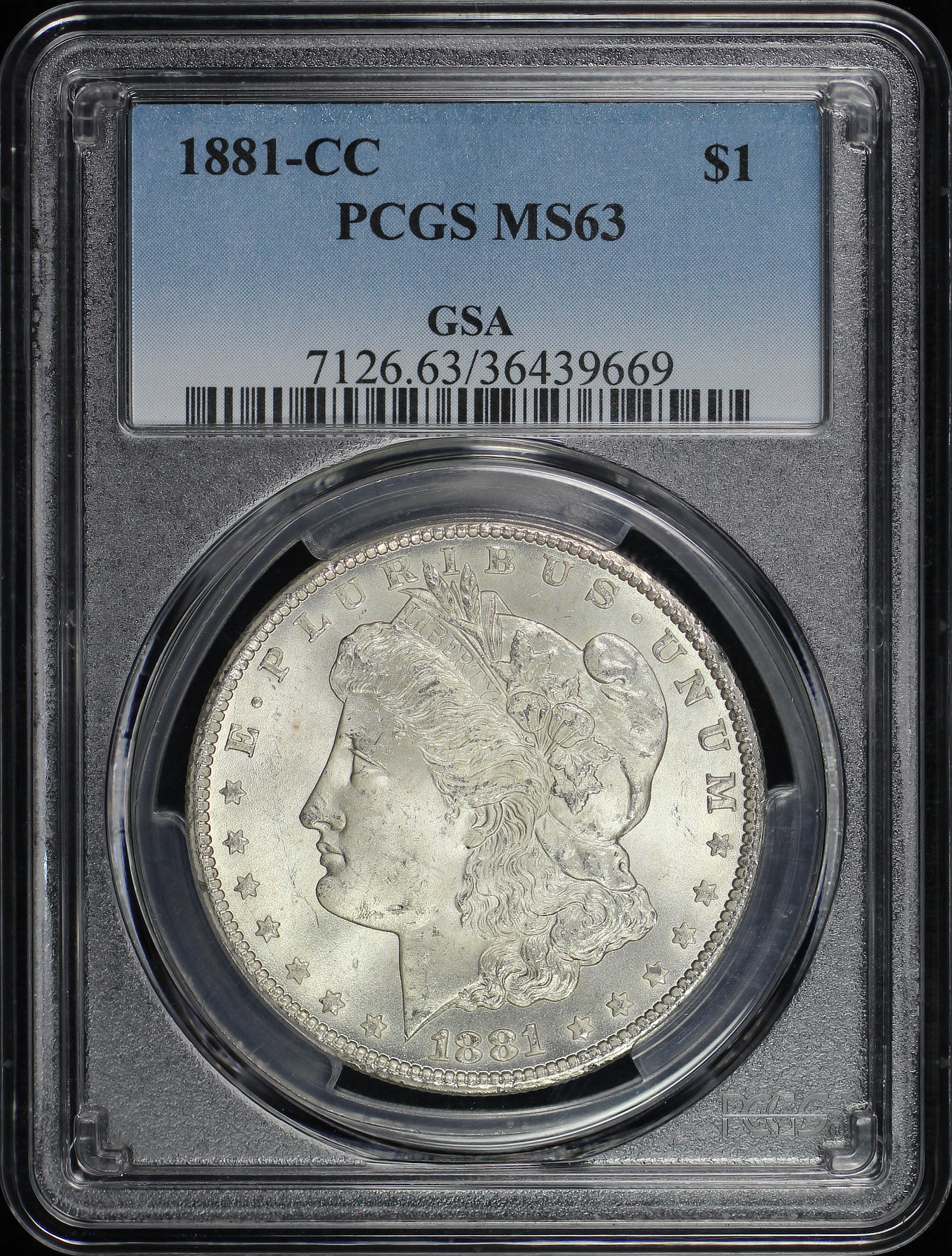 1881-CC Morgan Dollar GSA PCGS MS-63 designed by George T. Morgan.