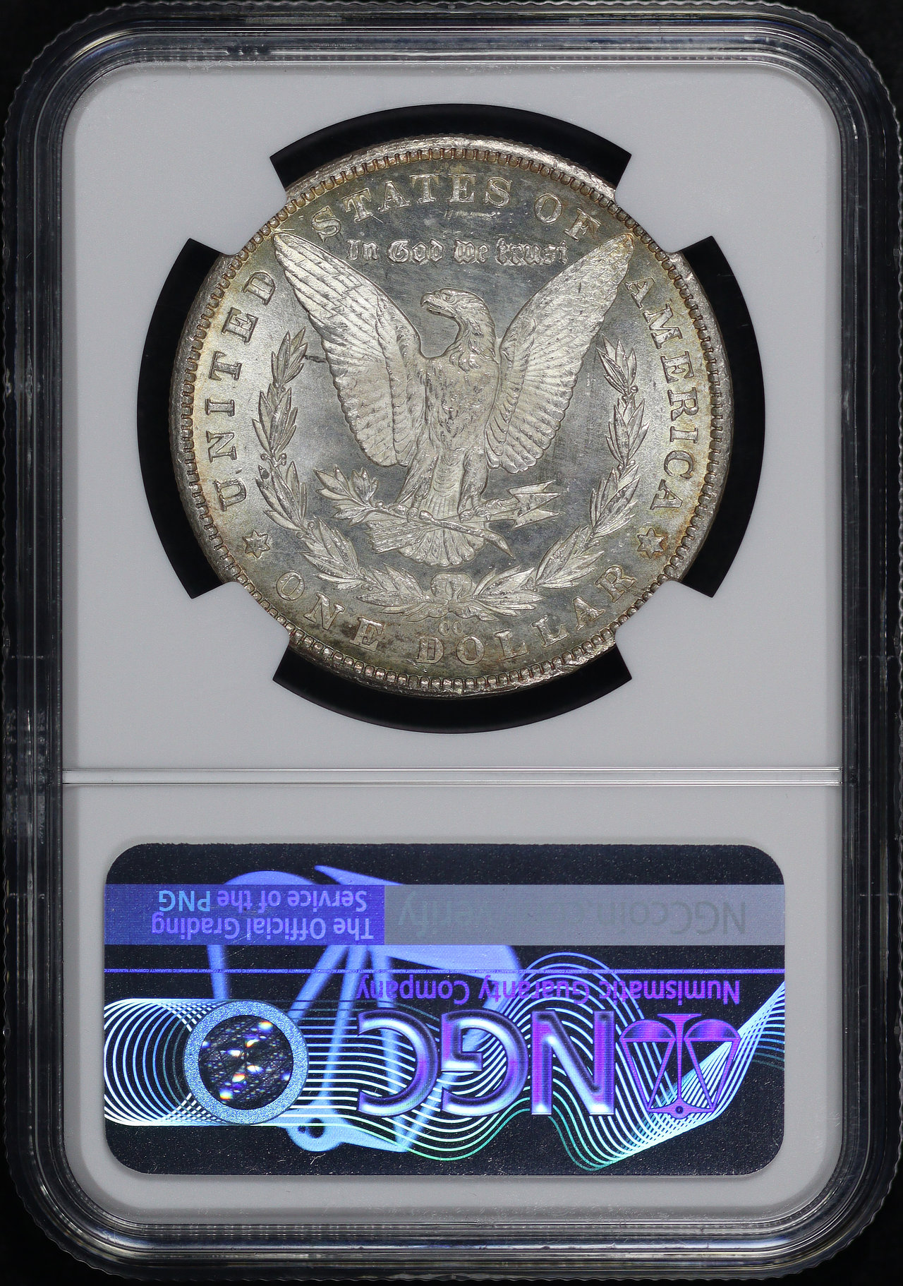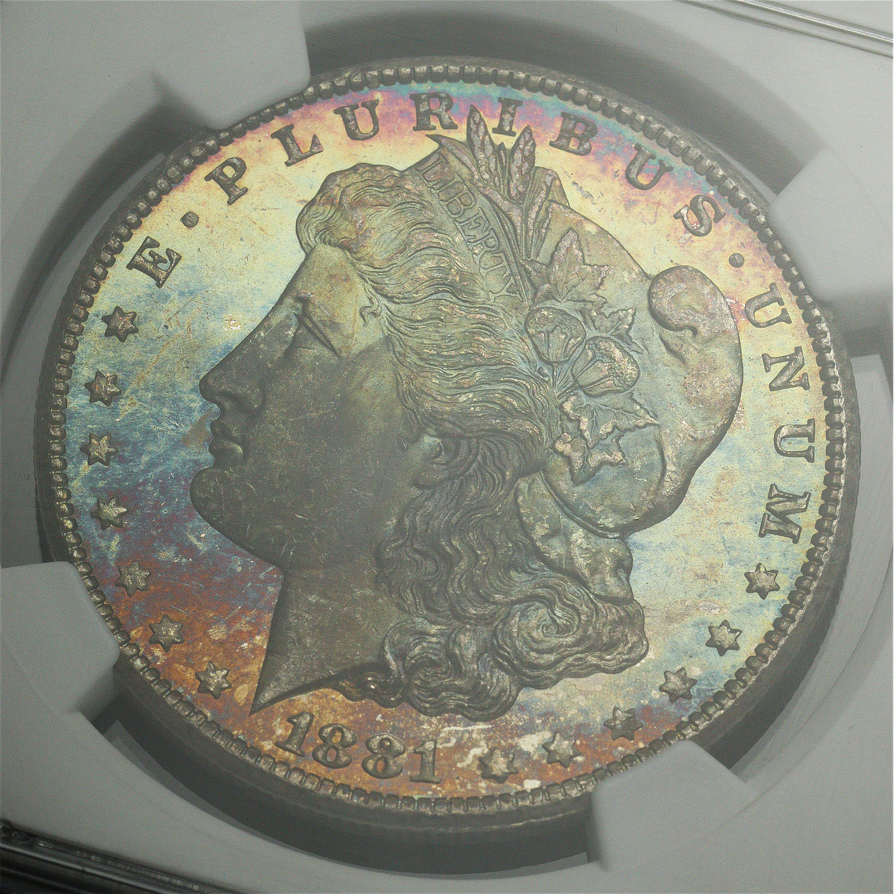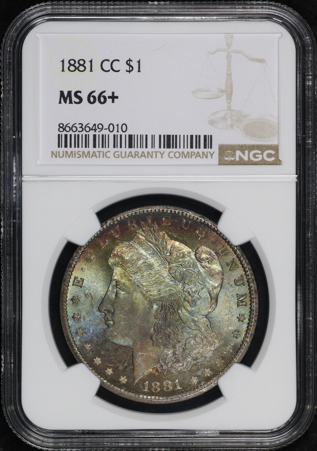 1881-CC Morgan Dollar NGC MS-66+. The obverse shows vivid rainbow toning, with excellent blue, green, violet and sunset hues, all in strong bands!