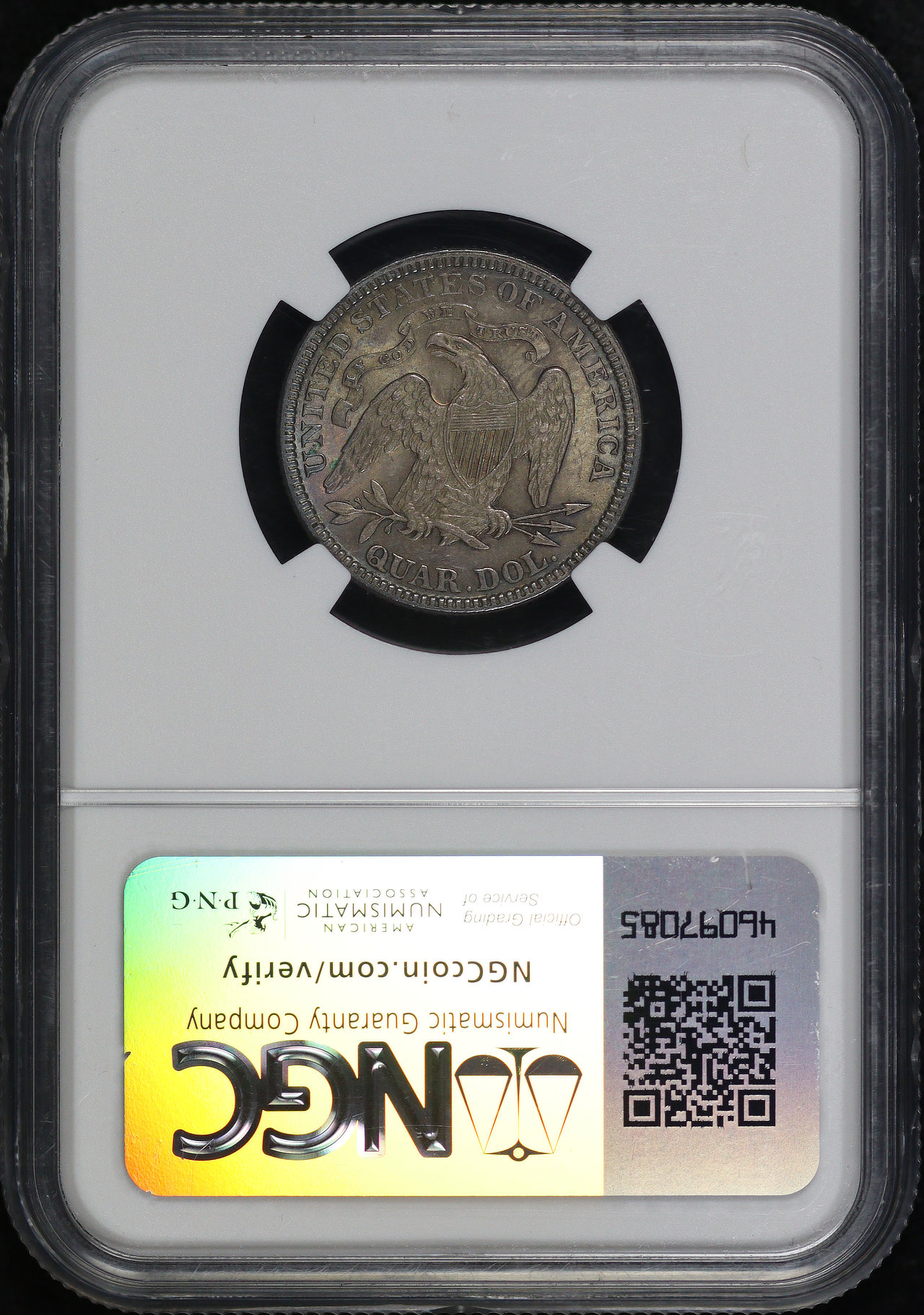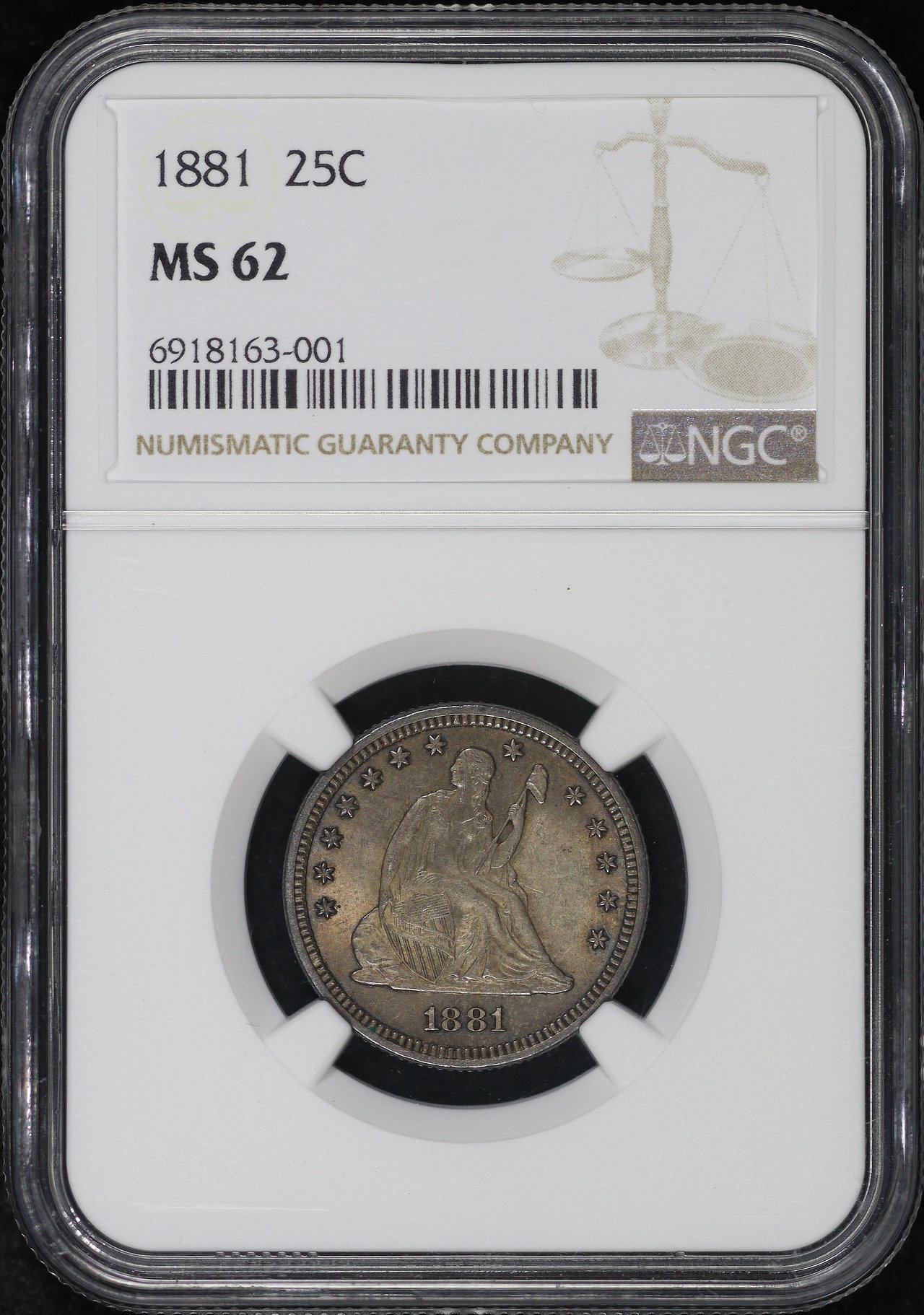 1881 Liberty Seated Quarter NGC MS-62. Both sides display dark, smoky sunset hue toning.