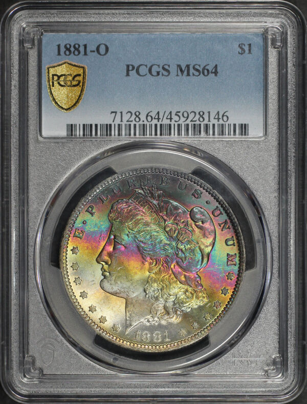 1881-O Morgan Dollar PCGS MS-64 designed by George T. Morgan. The obverse displays exceptional rainbow toning, boasting strong plum, green, yellow, and violet hues, all in nice, definite bands!