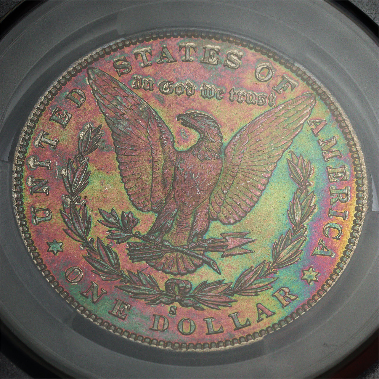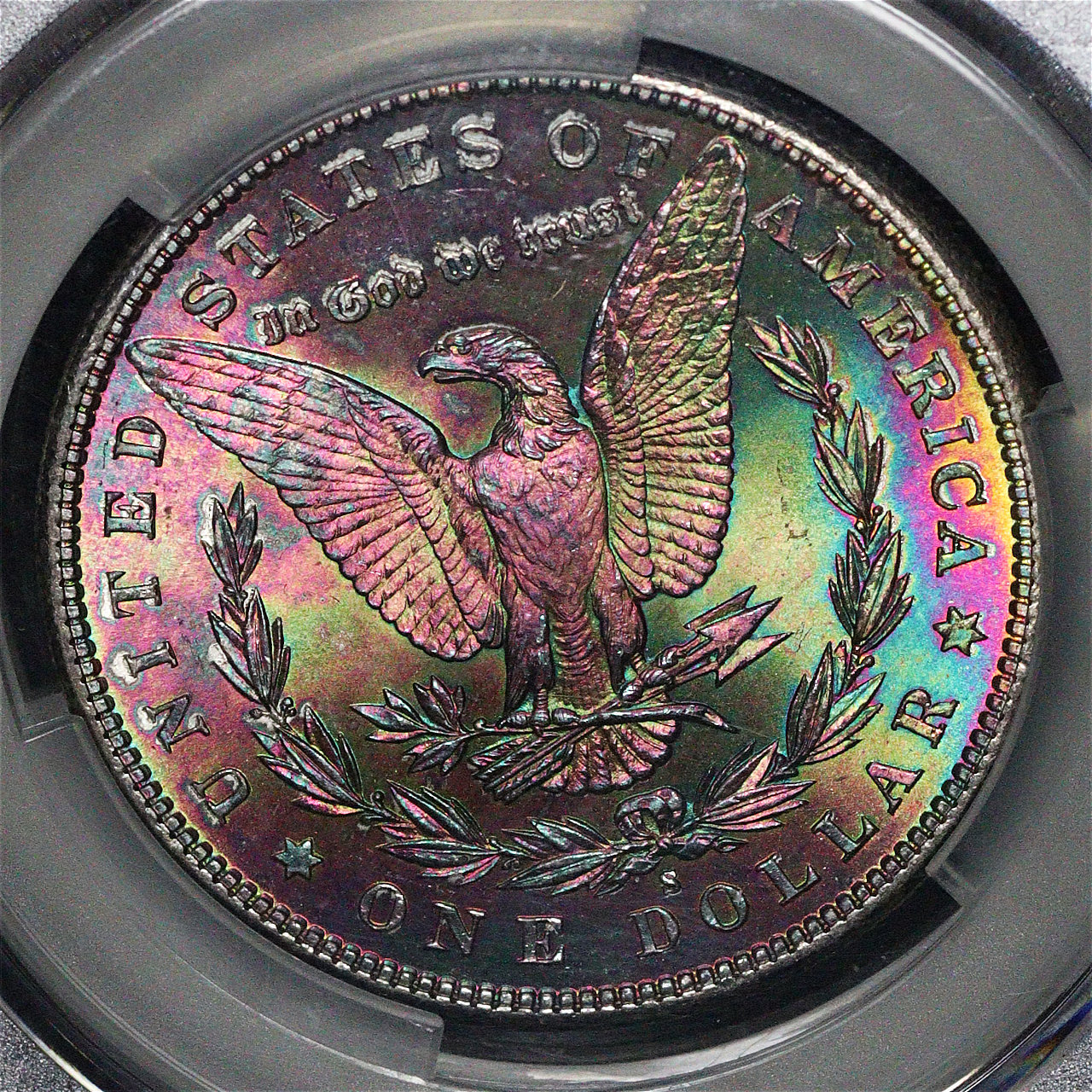 1881-S Morgan Dollar CACG MS-65. The reverse boasts exceptional rainbow toning, offering an incredible array of vivid violet, blue, green, and sunset hues, with strong cartwheel luster!