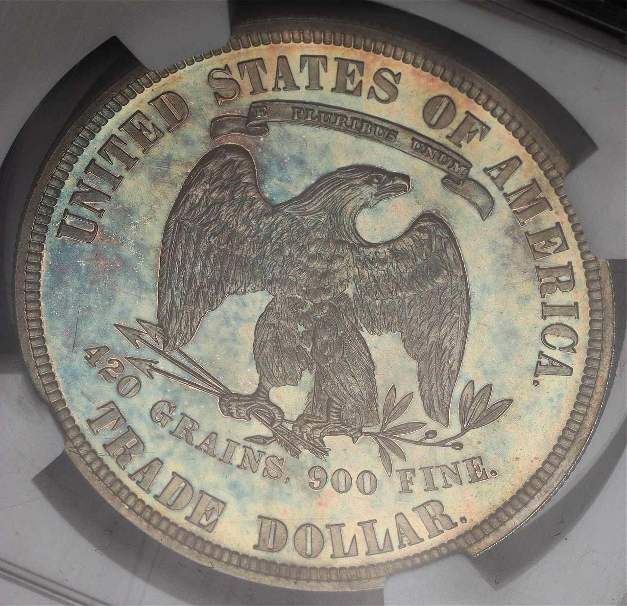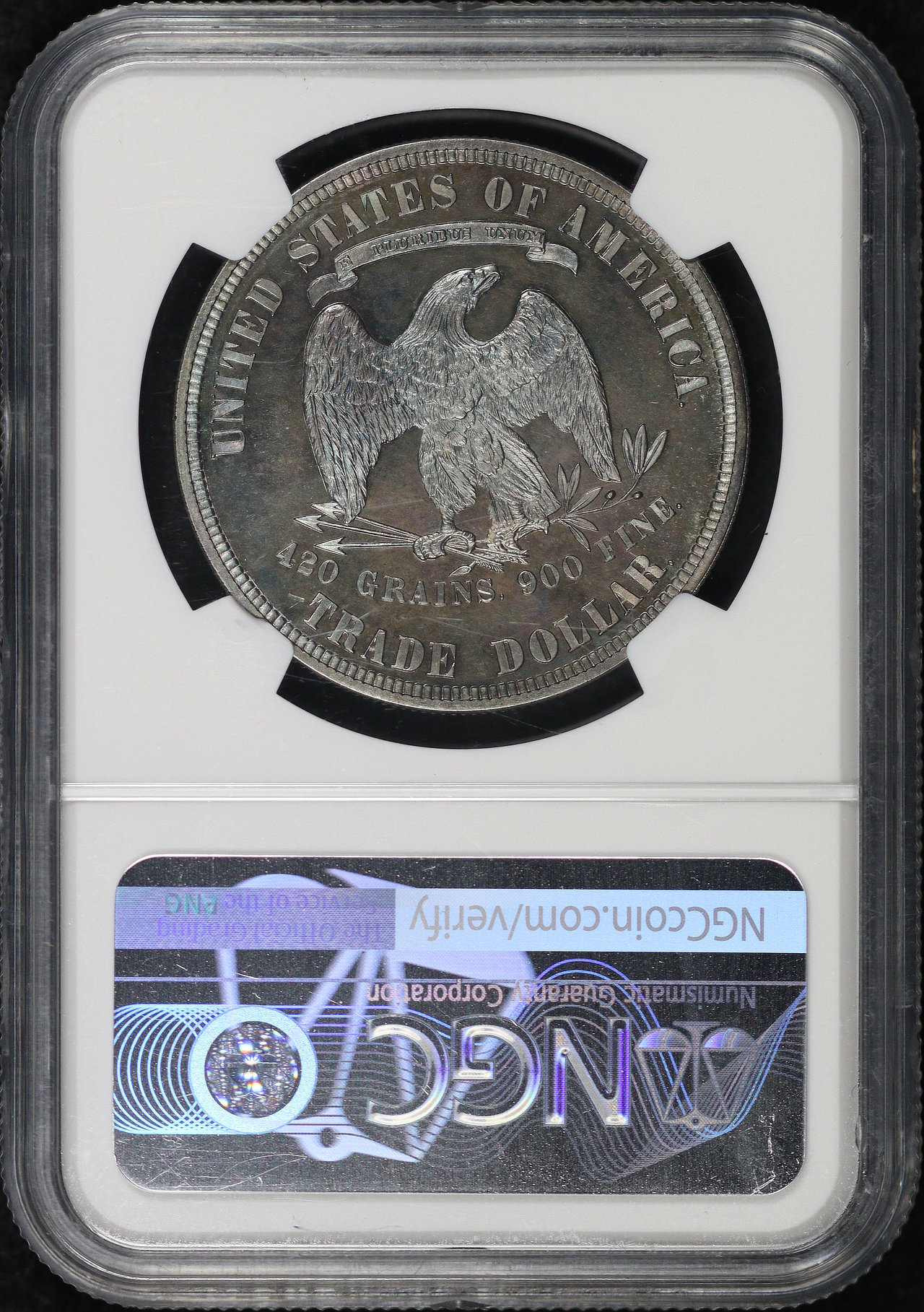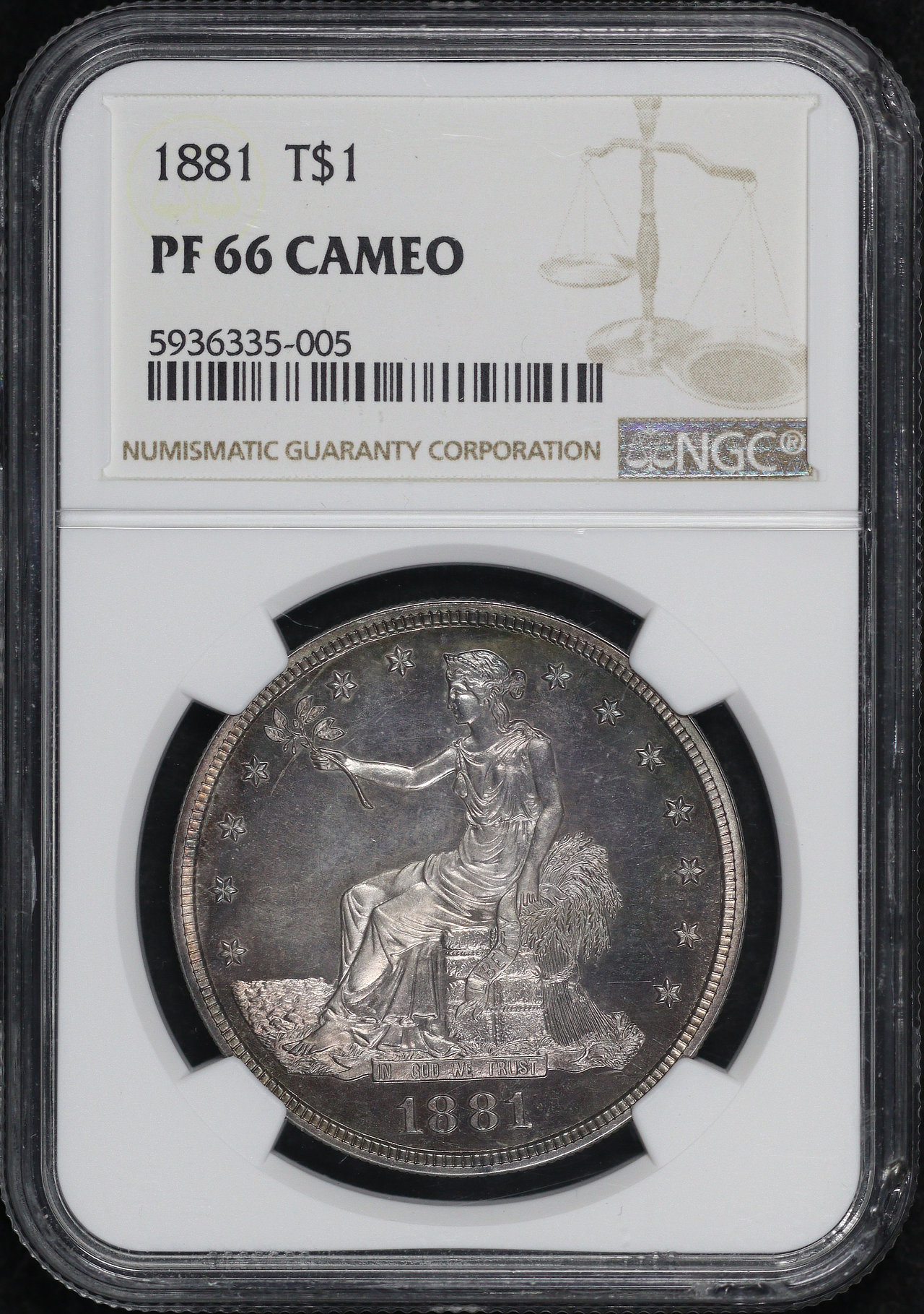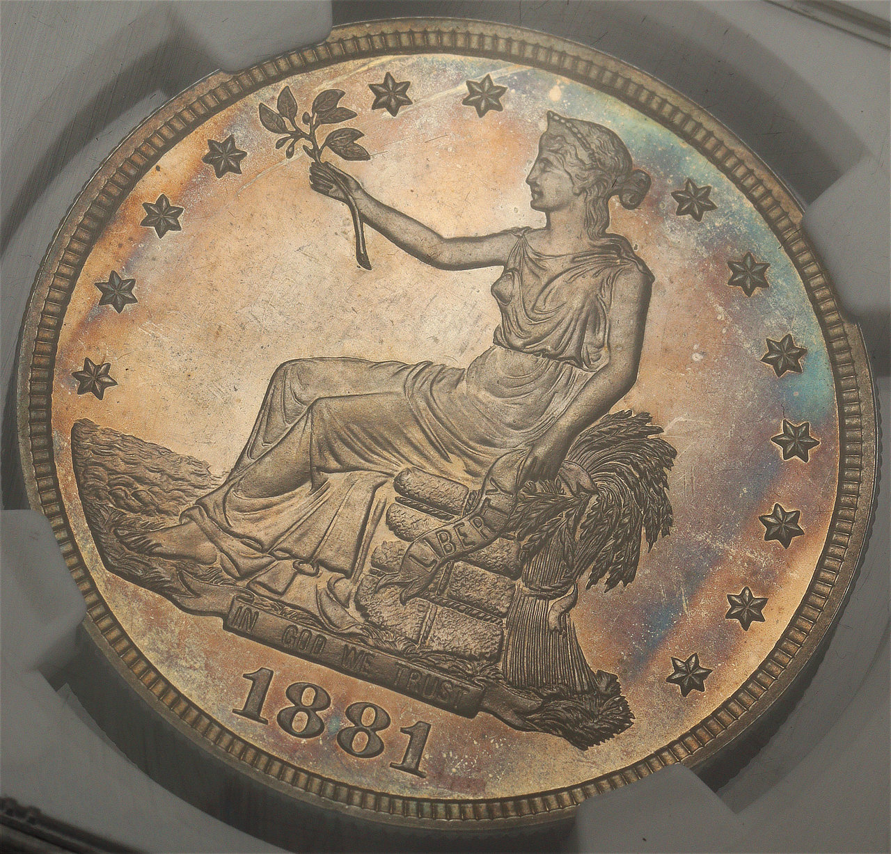 1881 Trade Dollar NGC PF-66 Cameo. Both sides display vibrant blue, green, and sunset hue toning!