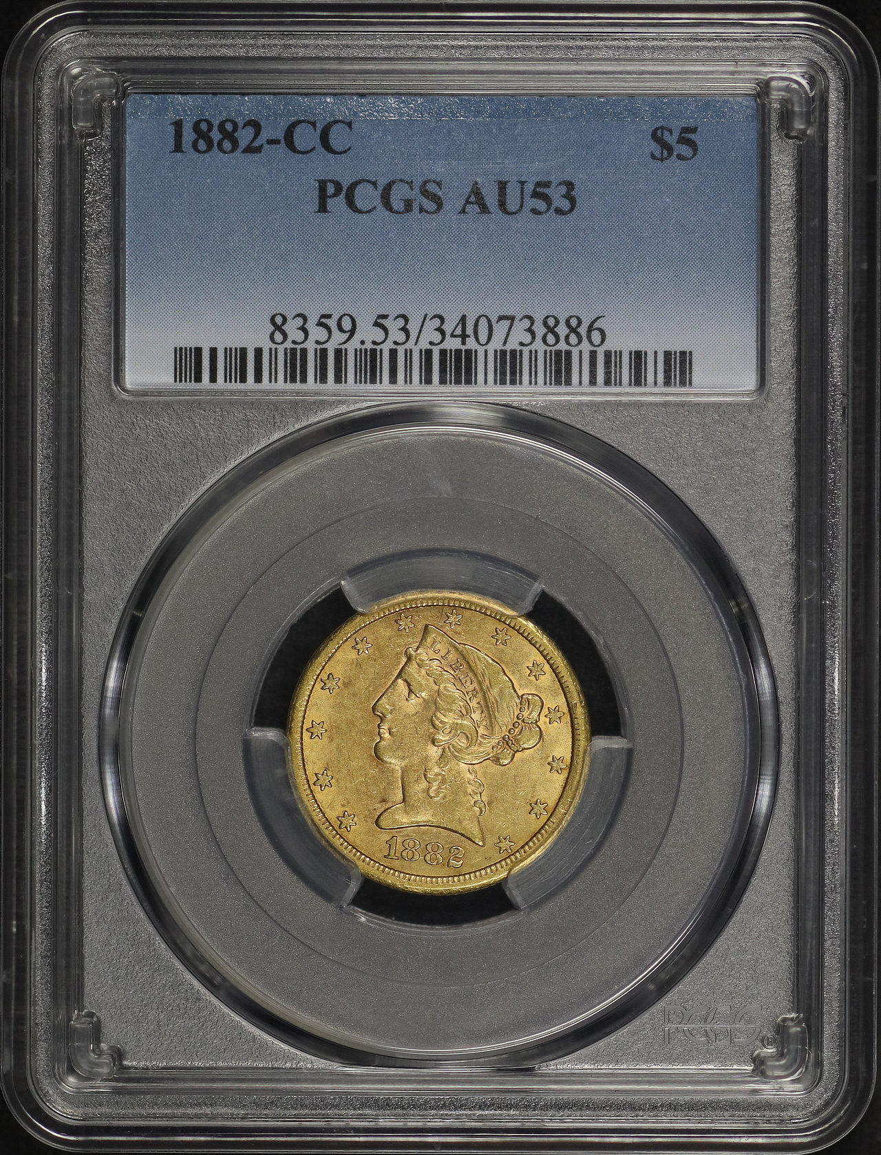 1882-CC Liberty Head $5 PCGS AU-53 designed by Christian Gobrecht.