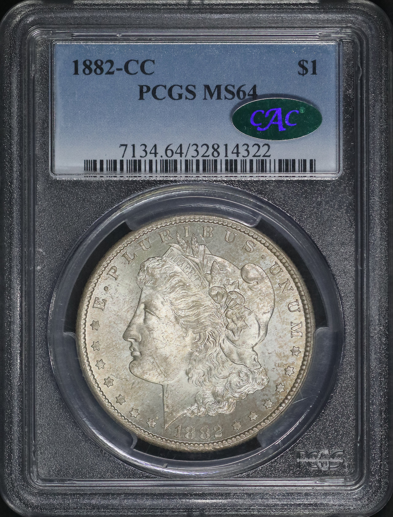 1882-CC Morgan Dollar PCGS MS-64 CAC designed by George T. Morgan.