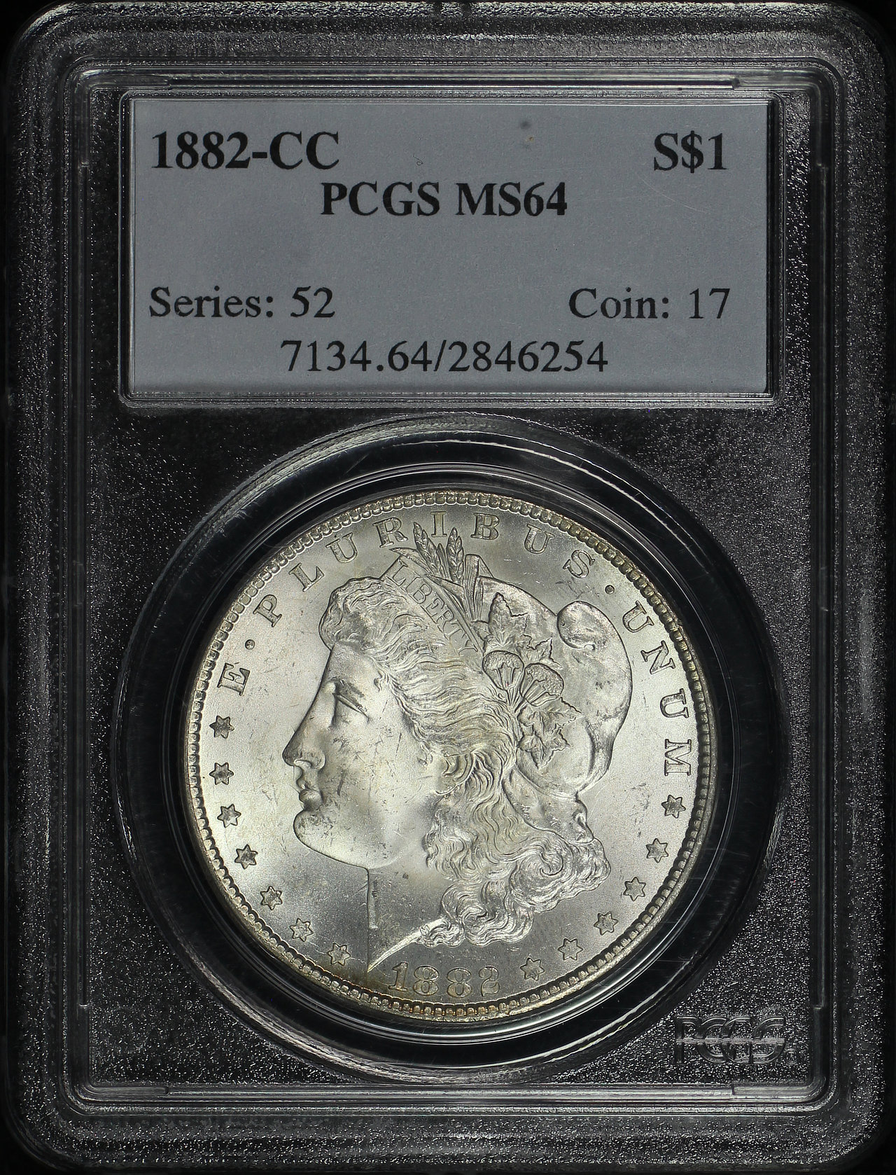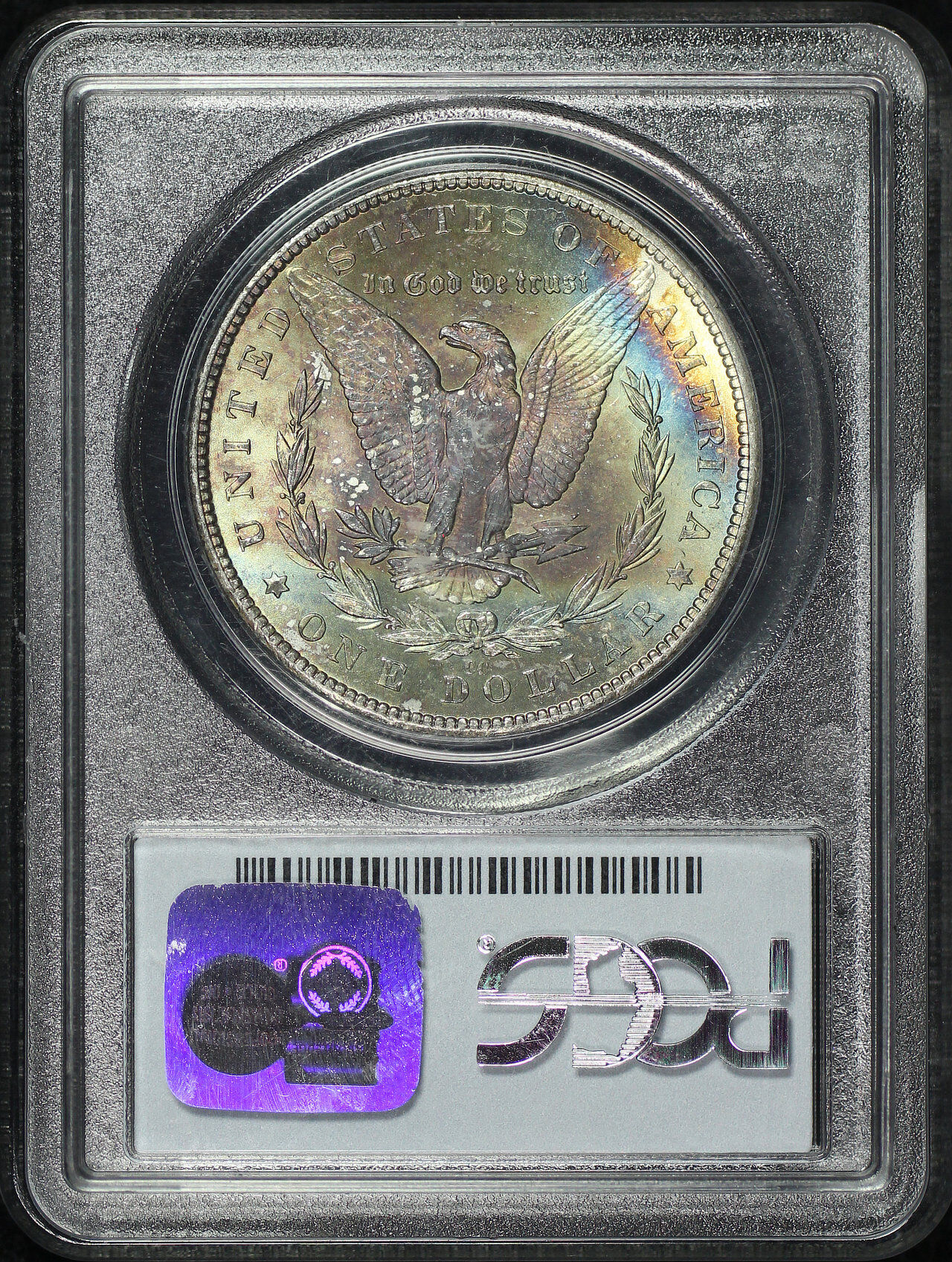 1882-CC Morgan Dollar PCGS MS-64 Reverse Rainbow Toning designed by George T. Morgan.