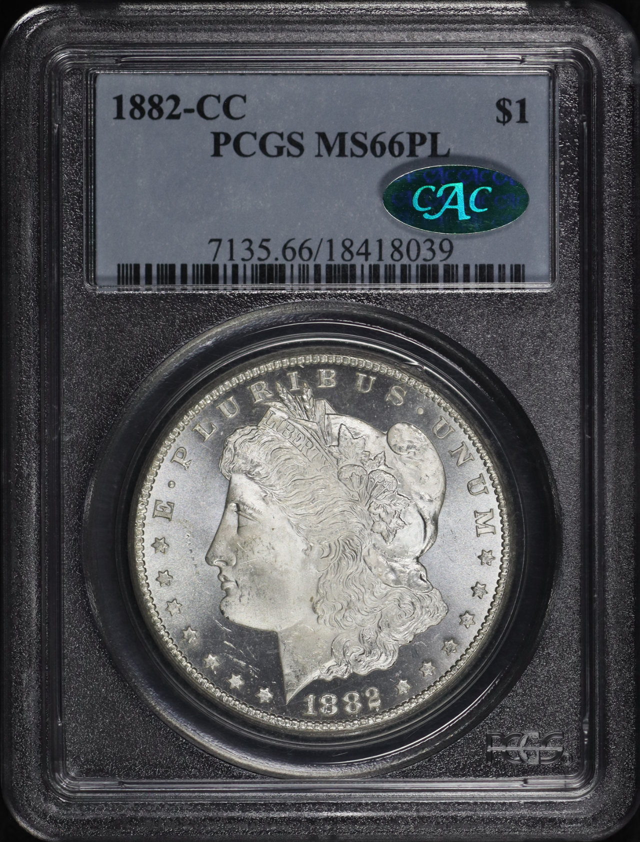 1882-CC Morgan Dollar PCGS MS-66 PL CAC designed by George T. Morgan.