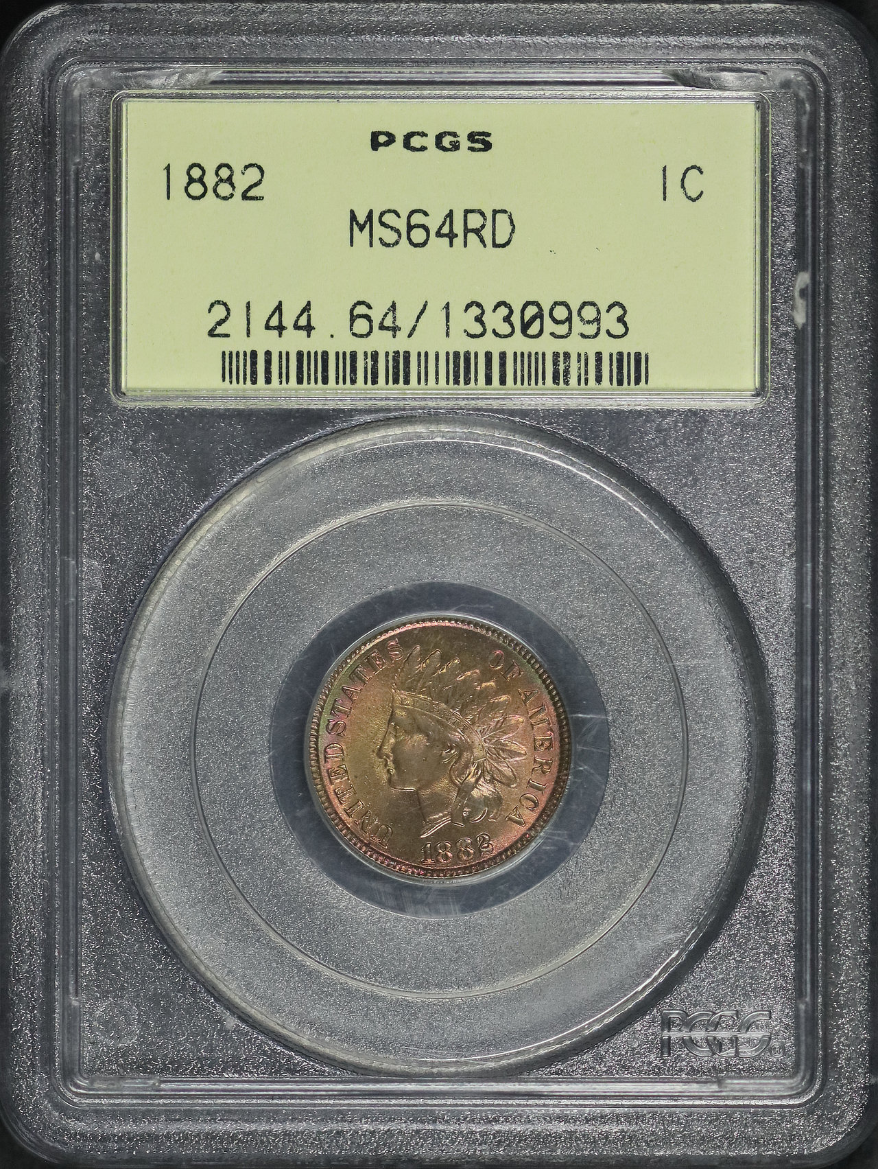 1882 Indian Cent PCGS MS-64 RD Old Green Holder designed by James Barton Longacre.