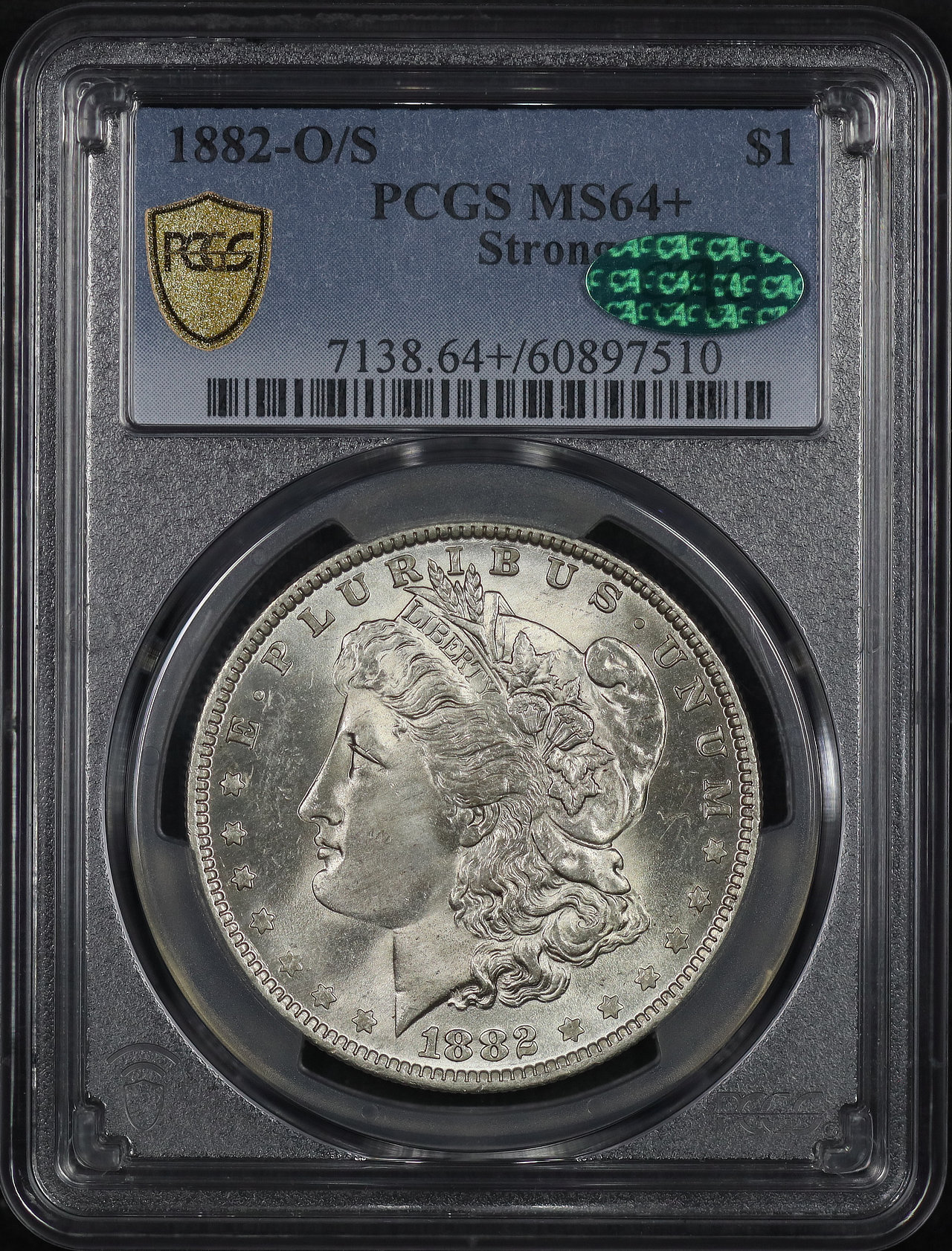 1882-O/S Strong Morgan Dollar PCGS MS-64+ CAC designed by George T. Morgan.